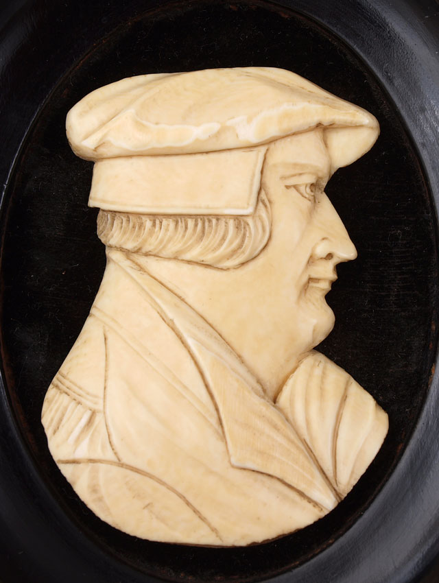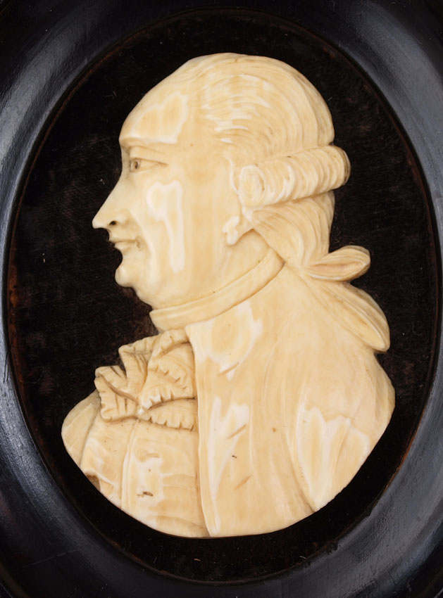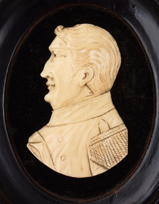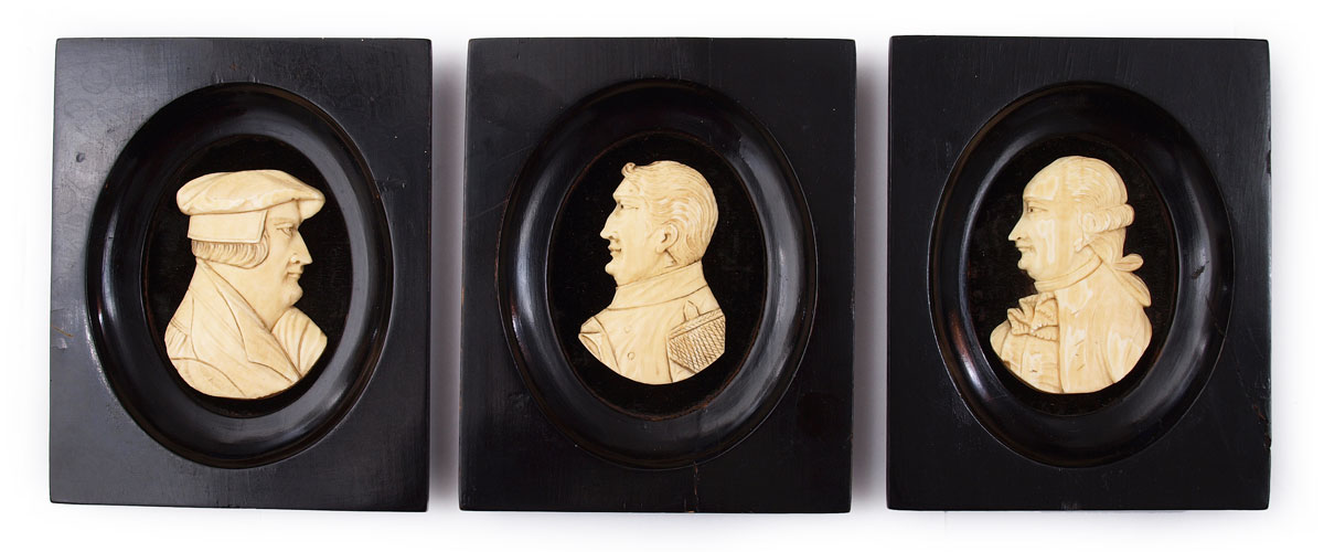 THREE 19TH CENTURY CARVED IVORY PROFILES: 1) Relief Silhouette of An Officer, sight size, 2 3/4'' x 1 3/4''; 2) Relief Silhouette of a Politician, 3'' height x 2'' width; 3) Appears to be an artist or writer, 2 7/8'' x 1 7/8''. All have matching finger carved and ebonized frames with wear, 5 3/4'' x 4 5/8''.