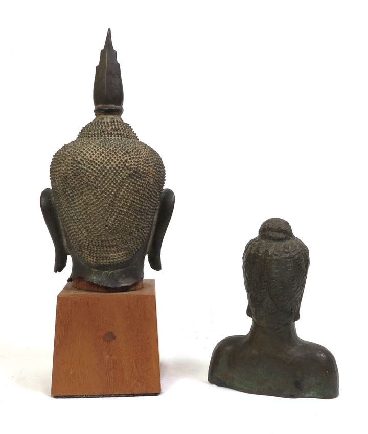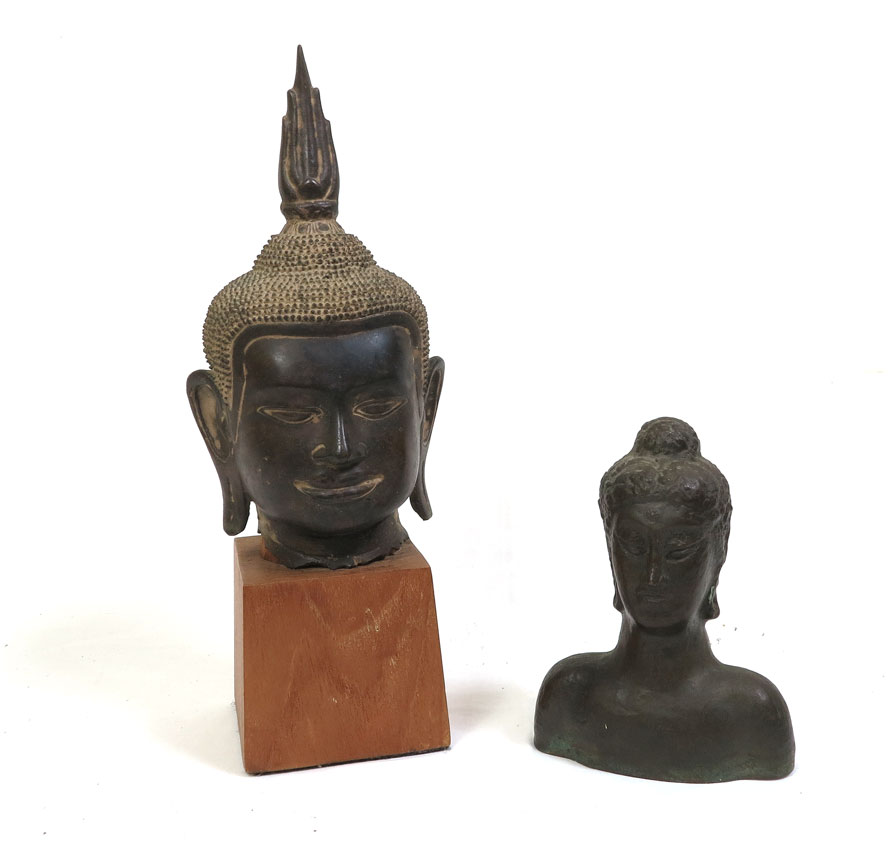 TWO BRONZE HEADS OF BUDDHA: 1) Larger Thai patinated head, 10 1/2'' high., excluding the 4'' wood base. 2) Smaller Hindu bust, 6.75'' x 5''. Actual age unknown. From the Estate of John Desmond and his wife Janina Hardoon Desmond.