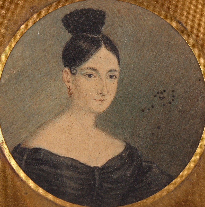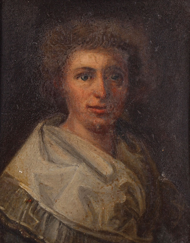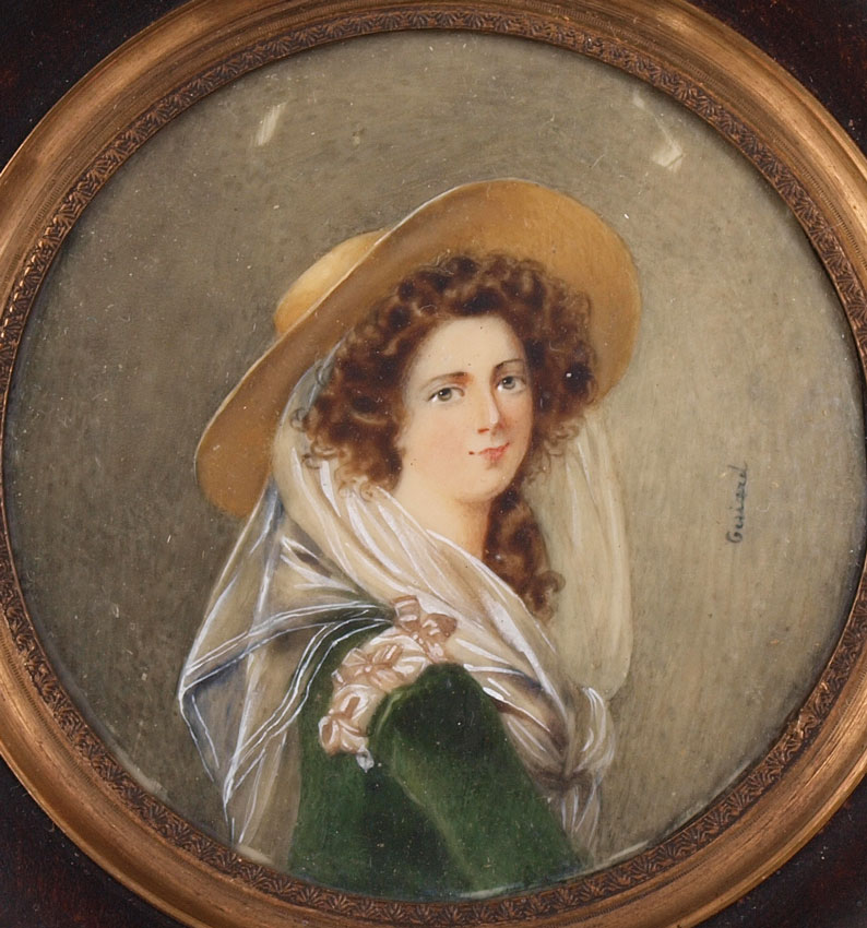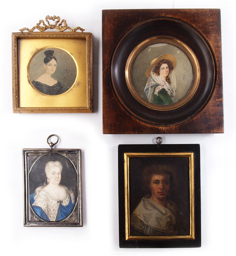 4 PIECE MINIATURE PAINTING LOT TO INCLUDE: 1) 19th Century Watercolor of a Young Black Haired Beauty, Circular 2'' diameter, encased in gilt metal frame with ribbon cartouche, 4 3/8'' x 3 1/2'', no visible signature. 2) Young Girl wearing a Hat & Scarf, Circular, 2 3/4'' diameter, signed lower right, Guiard, encased in finger carved molding, 5 1/2'' x 5 1/4''. 3) 19th Century Portrait of an Elderly Woman in an Evening Gown, Oval, 3'' x 2 1/4'', no visible signature, encased in silver metal frame, 3 1/2'' x 2 5/8''. 4) 19th Century, Oil/Board, Middle Aged Woman, sight size 3 1/2'' x 2 5/8'', no visible signature, ebonized wood frame with gilt metal liner, 4 1/2'' x 3 5/8''.