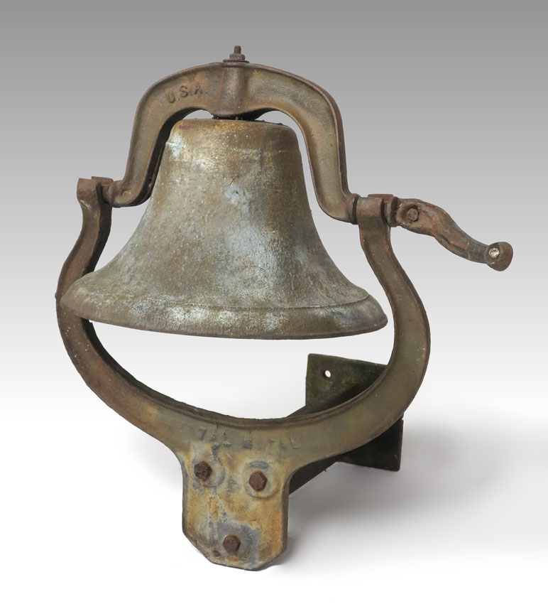 LARGE CAST IRON SCHOOL BELL: Ranch or school bell with mount. Bell marked USA, Patt. 1880. Bell 12 1/2'' x 22 1/4'' overall, mount 15 1/2'' x 18 3/4'' x 19 3/4''.