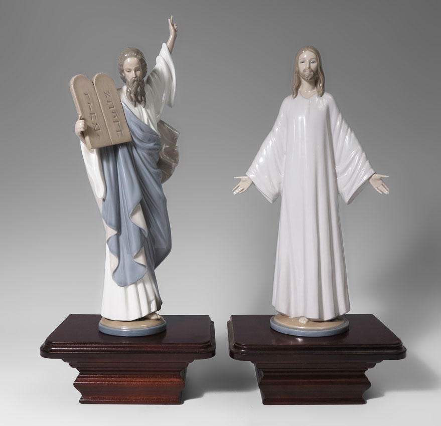 LLADRO PORCELAIN FIGURINES, JESUS & MOSES: Both by Francisco Catala 1) JESUS #5167, issued 1982 retired 1991, 15 1/2'' 2) MOSES #5170, issued 1982 retired 2000, 17 1/4''h. No boxes but sold with wall sconce display shelves.