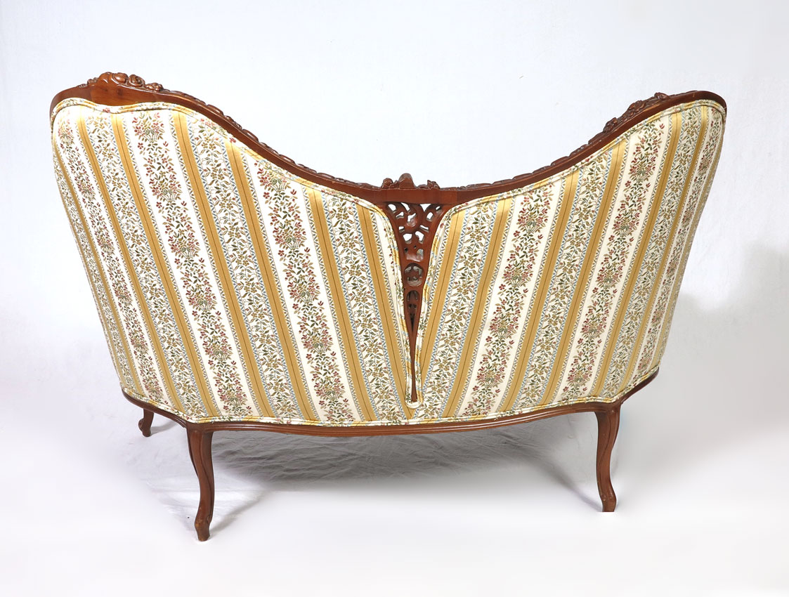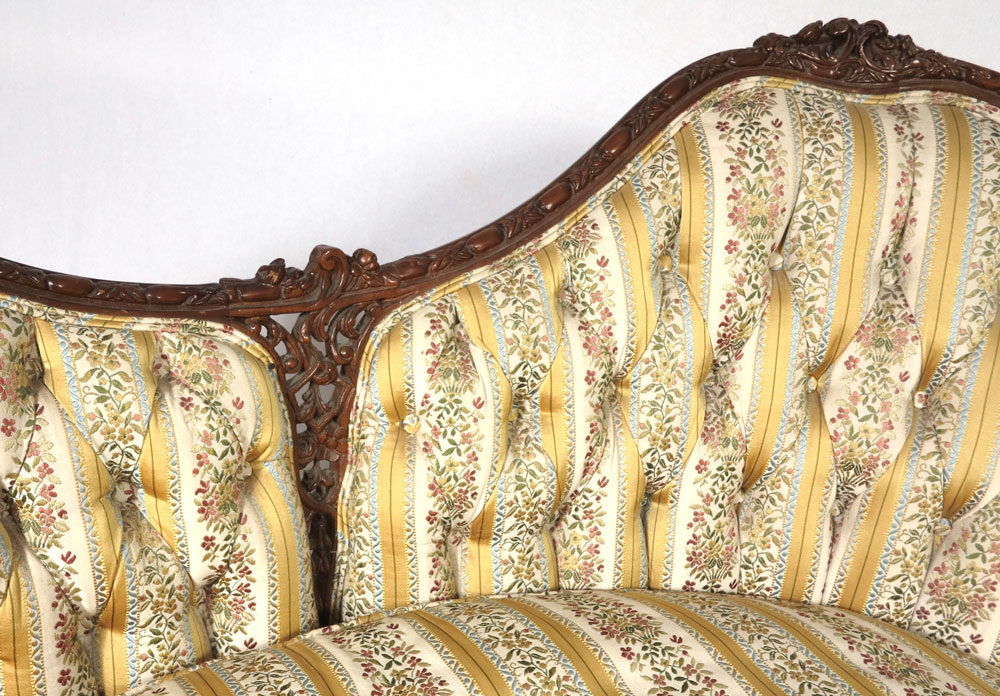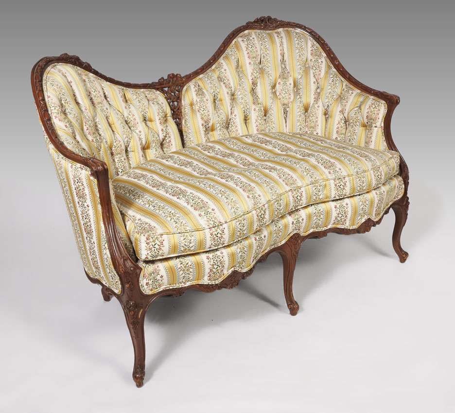 FRENCH STYLE CARVED CANAPE: Turn of the 20th C, well carved settee with dip on the center top rail with two sides divided by pierced carving. The top rail curves and continues to the arms, carved skirt, single down cushion. Approx. 33''h. x 46'' x 27''.