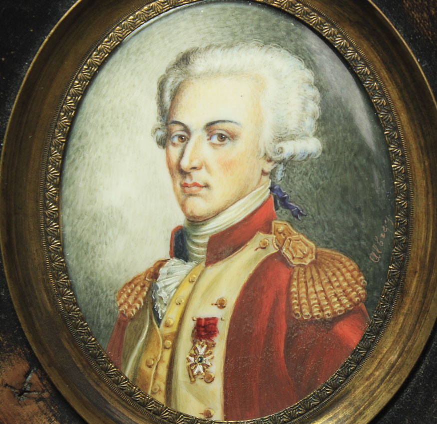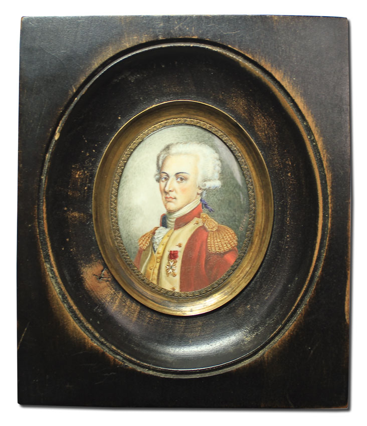 MINIATURE MILITARY PORTRAIT ON IVORY SIGNED ALDREY: Sight size, 2 1/4'' x 1 3/4'', oval, signed in the right margin, finger molded frame, 5'' x 4''.