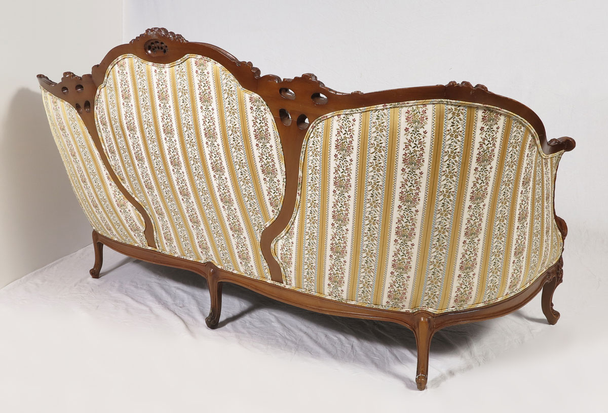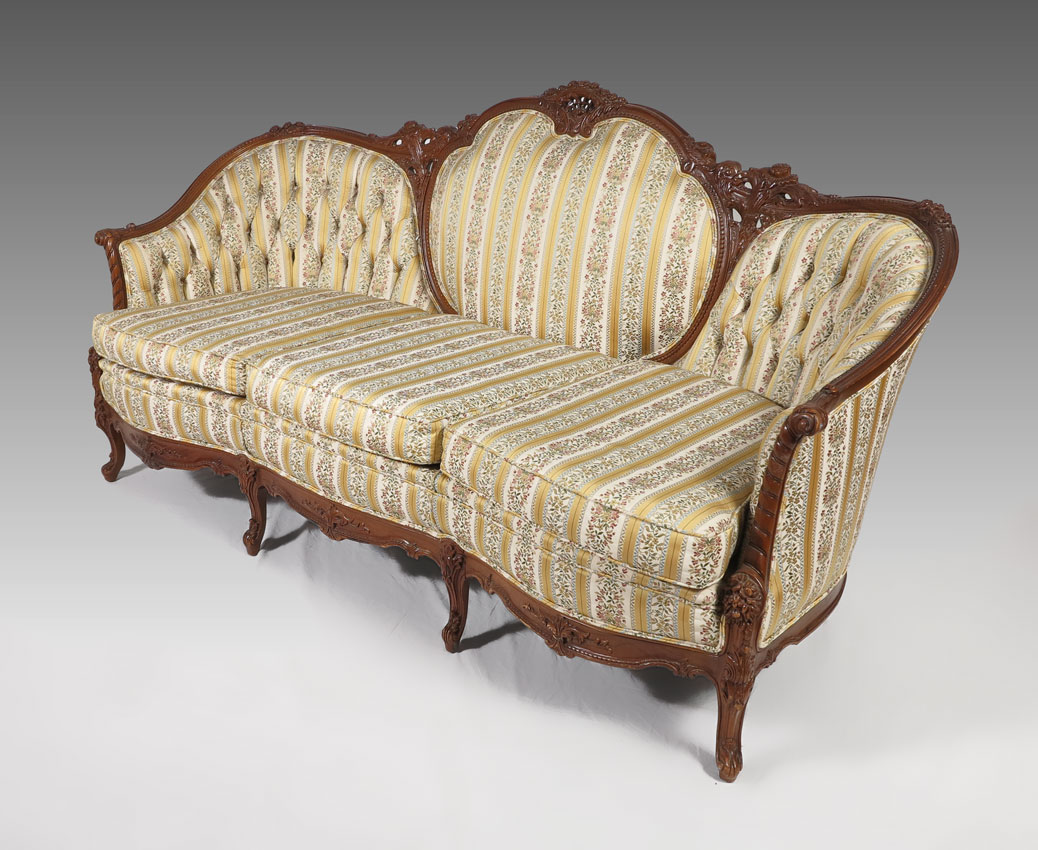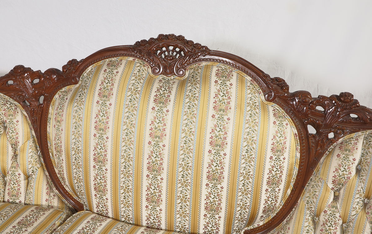 WALNUT FRENCH STYLE CARVED SOFA: Early 20th C. medallion back flower motif carved sofa, the top rail continues into the arms. Three cushion under center medallion and side button and tufted back. Measures approx. 76'' long x 39'' tall x 36'' deep.