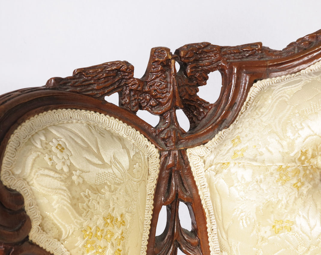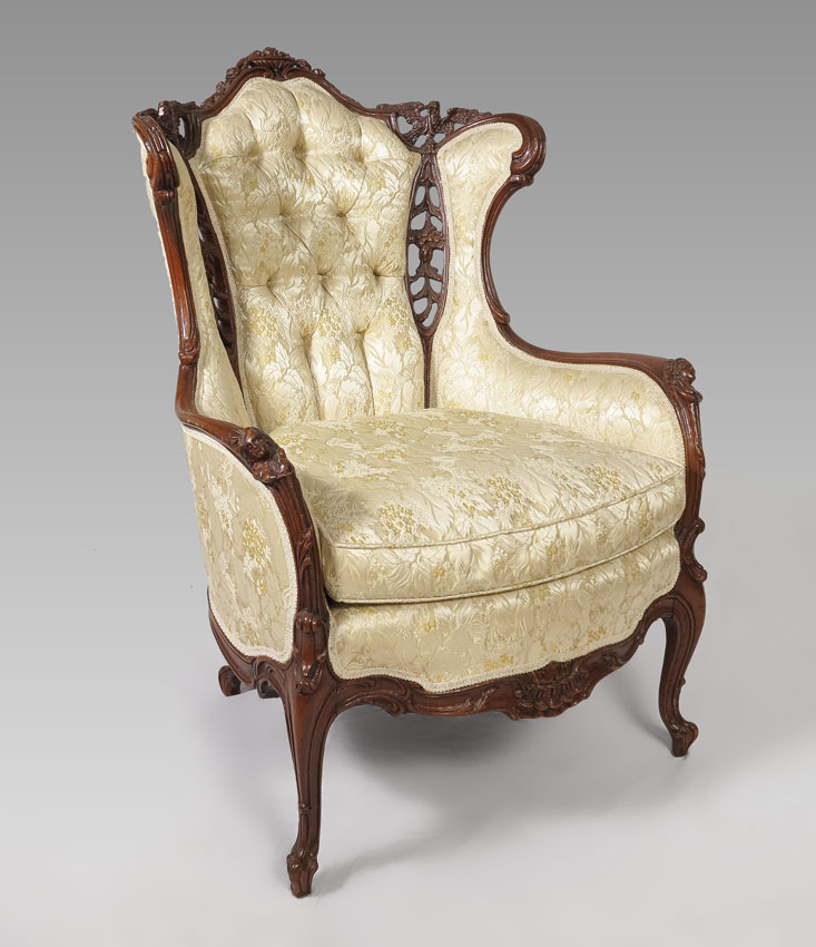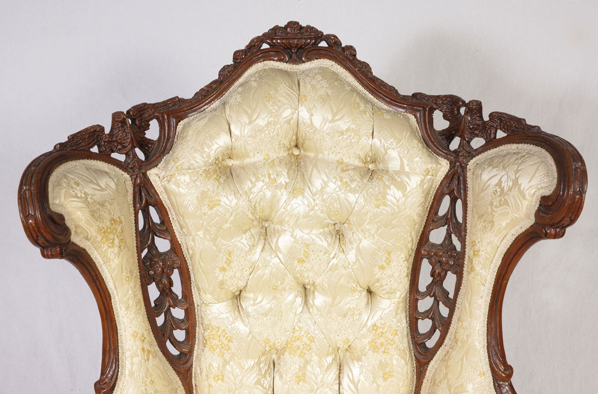FRENCH CARVED TALL BACK BERGERE CHAIR: The arched crest centering a flower filled urn, the side with pierce carved panels surmounted by carved eagles. Down cushion, button and tufted back. Measures approx. 45''h. x 37'' x 28''.