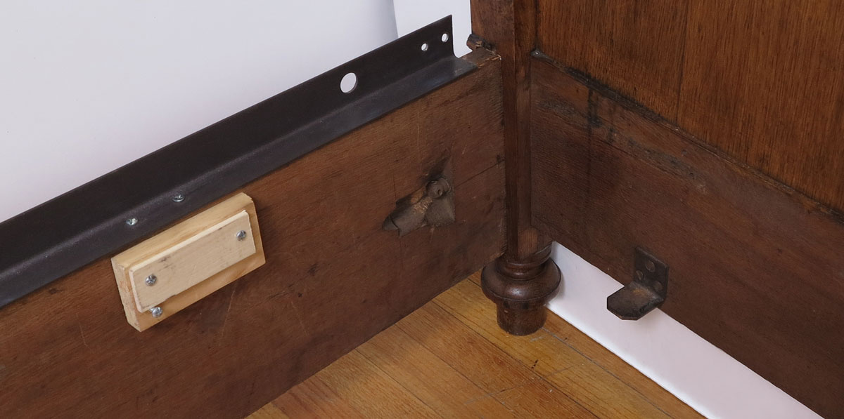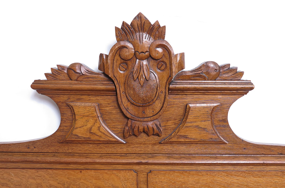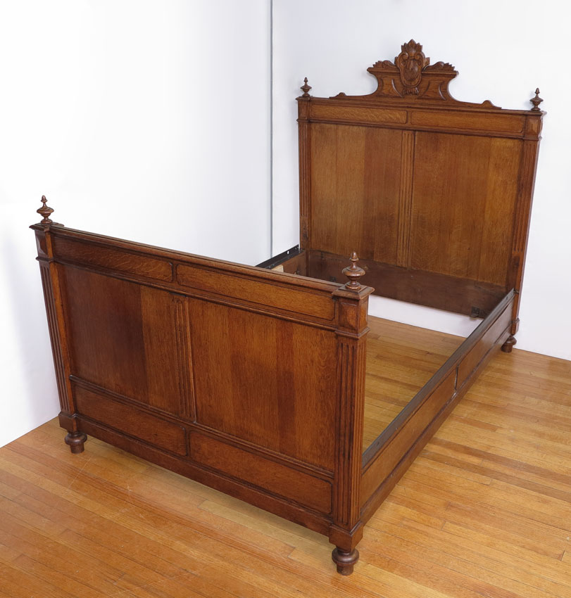 LATE VICTORIAN CARVED OAK BED: Full size, carved top rail on the high head board. Head board 63 3/8'' h. x 54 1/4'' x 3 3/4'', foot board 43 1/4'' h., rails 75 1/2'' l.