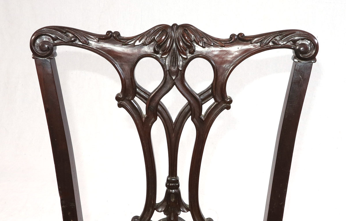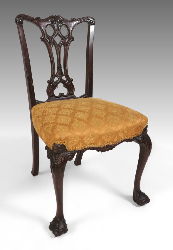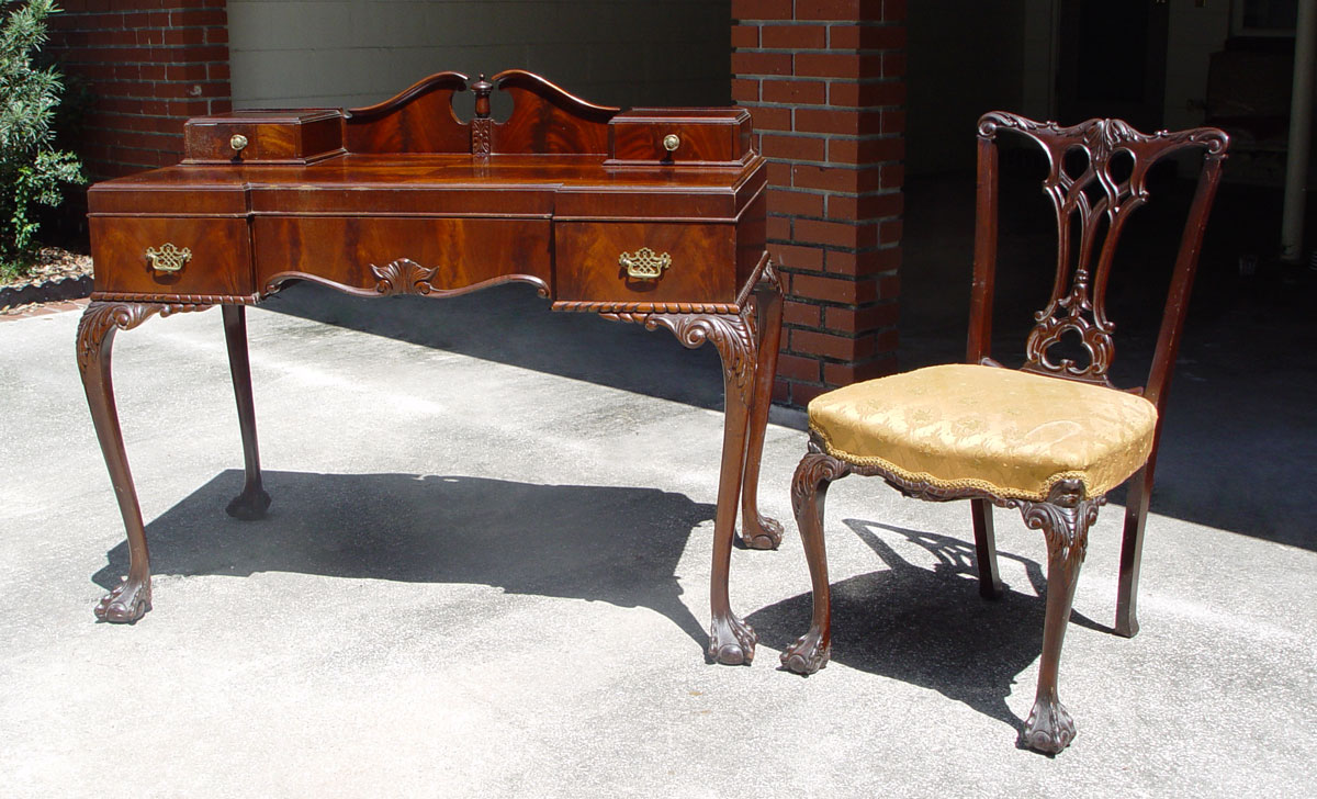 MAHOGANY CHIPPENDALE STYLE DESK AND CHAIR: To include 1) Desk with broken arch and finial crest and 2 top drawers over shaped central drawer and 2 side drawers. All on 4 carved and shaped legs ending in ball and claw feet. 36 3/4'' h. x 46'' x 26''. 2) Chair with carved frame, carved and shaped front legs, gold patterned upholstery. 34 1/4'' h. x 19 1/2'' x 21 1/2''.
