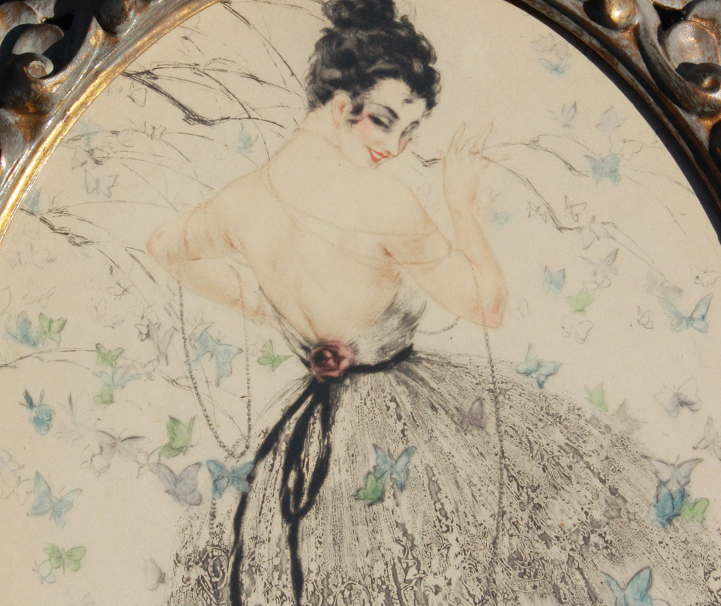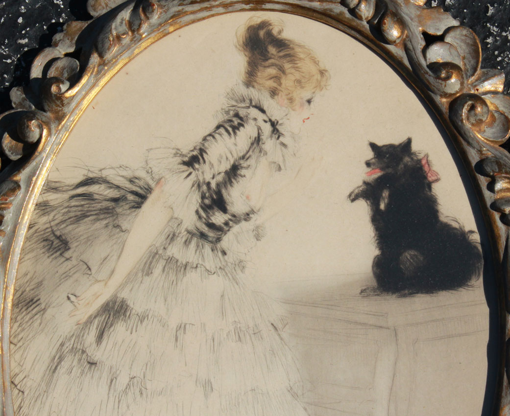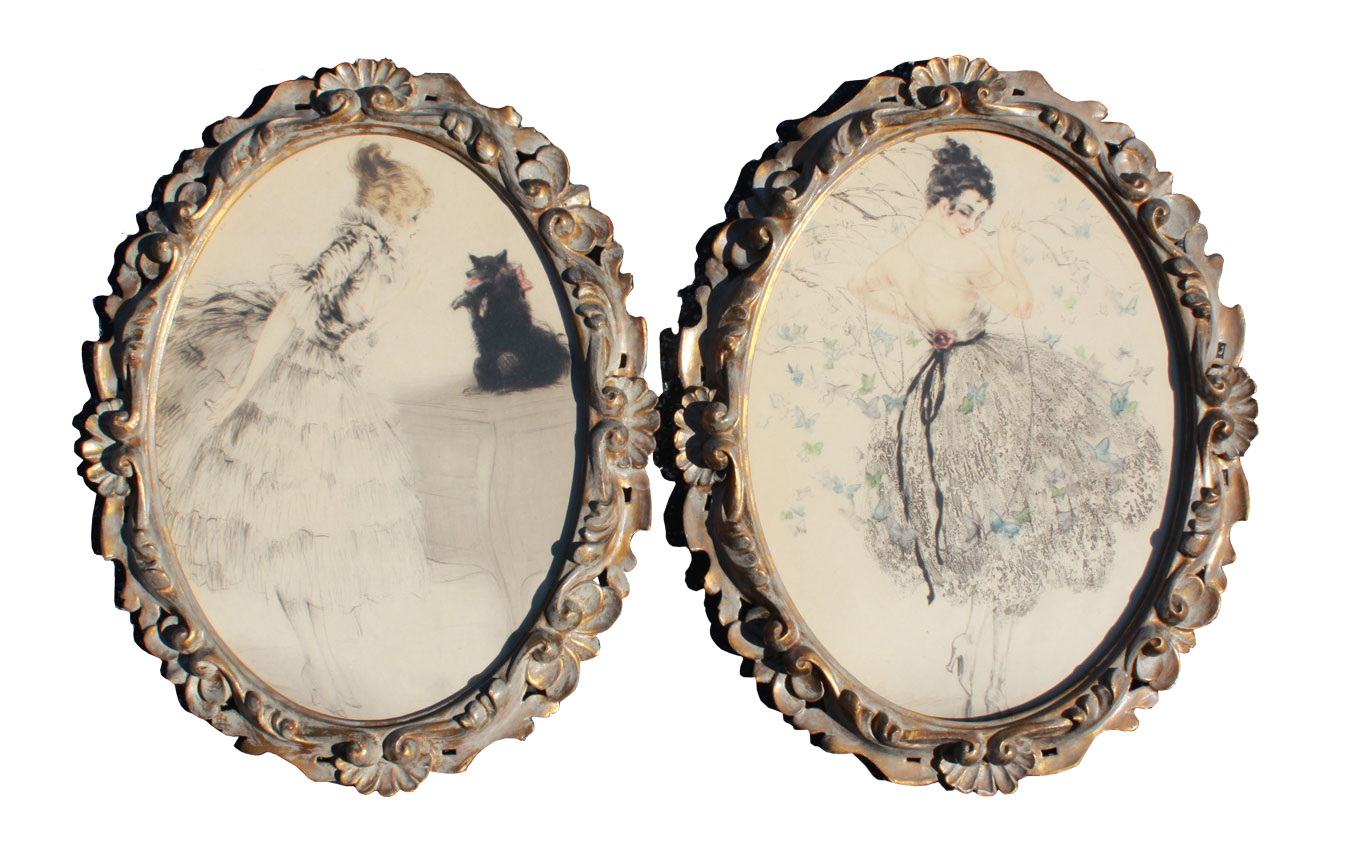 TWO ICART STYLE FRENCH BOUDOIR ETCHINGS: Oval dimensions, 15'' x 11'', most likely by Grellet, encased in fine custom gilded and carved foliate motif frames, 19'' x 15''.
