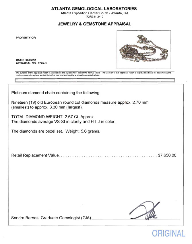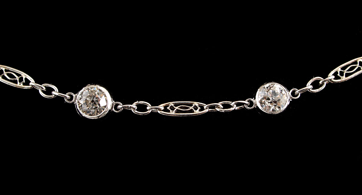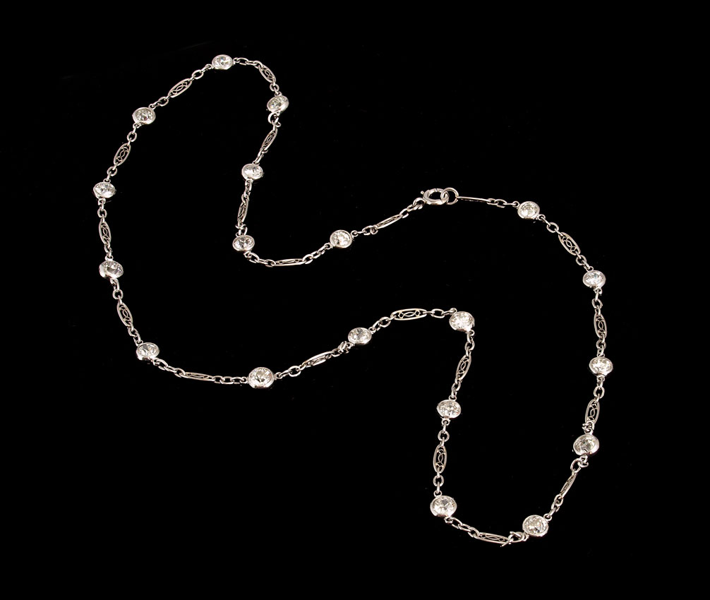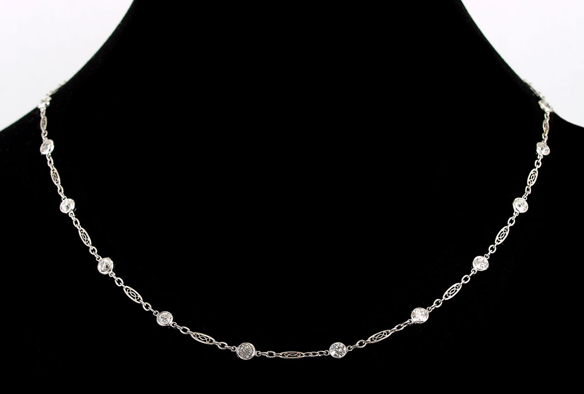 ART DECO PLATINUM DIAMOND CHAIN NECKLACE: Platinum 15'' chain with 19 old European round cut diamonds, totaling approx. 2.67 Ct. The bezel set diamonds average VS-SI in clarity and H-I-J in color. Weight 5.6 grams. Sold with current Atlanta Gemological's GIA graduates appraisal for $7,650.