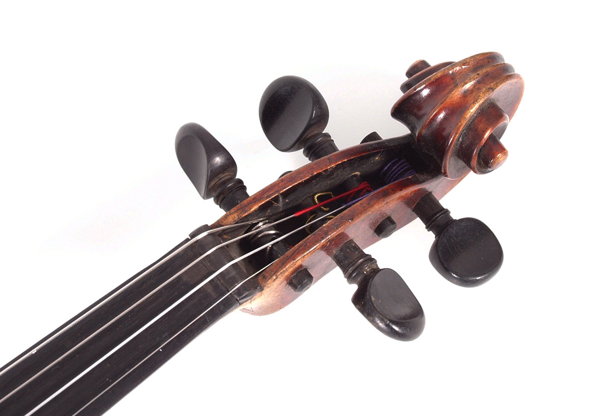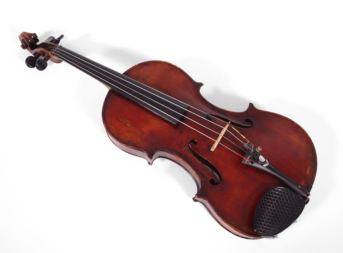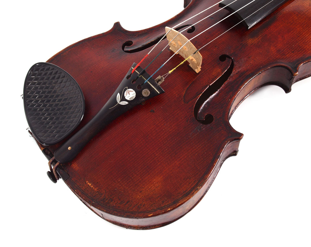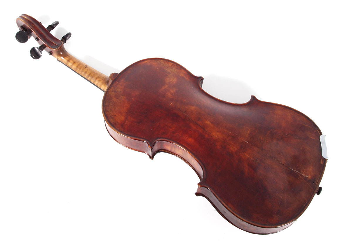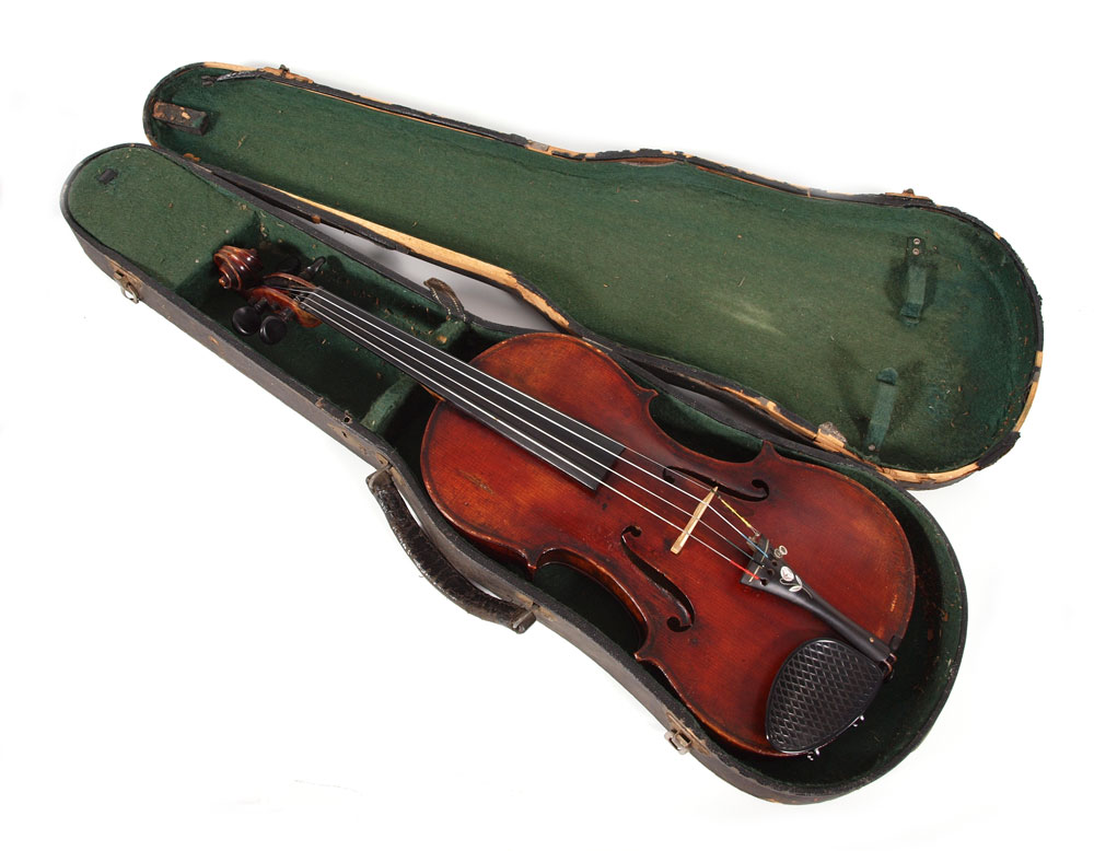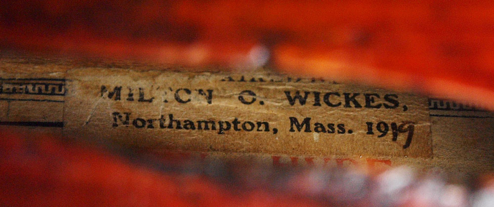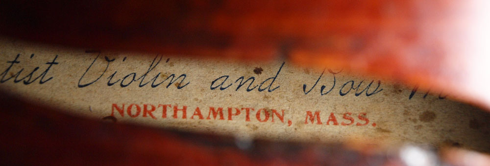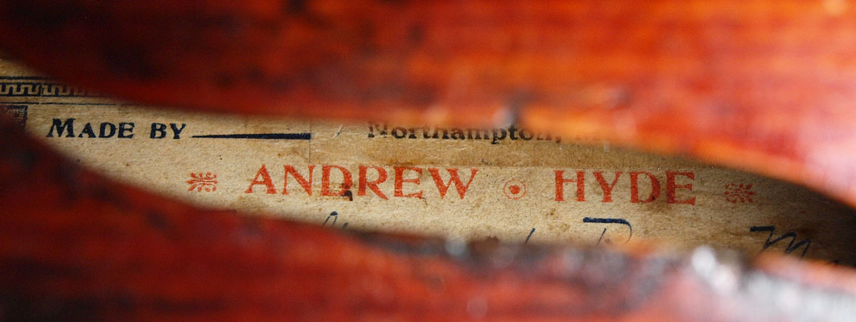 1908 ANDREW HYDE NORTHAMPTON VIOLIN: Makers label reads ''Andrew Hyde, Artist Violin and Bow Maker, No. 1285, AD 1908. Signed in ink inside back and top, stamped Hyde. Secondary label for Milton Wickes dated 1919 as well. Back 14'', overall 23 1/2''. Sold with hard case, 4 1/2'' x 31 1/2'' x 9 3/8''. No bow.