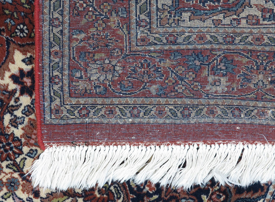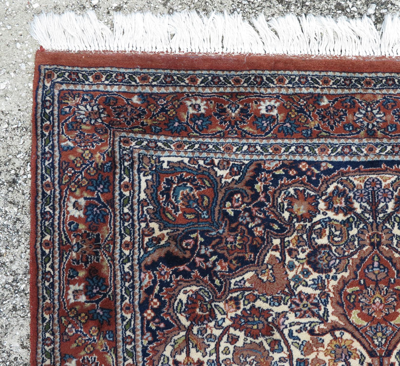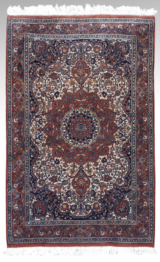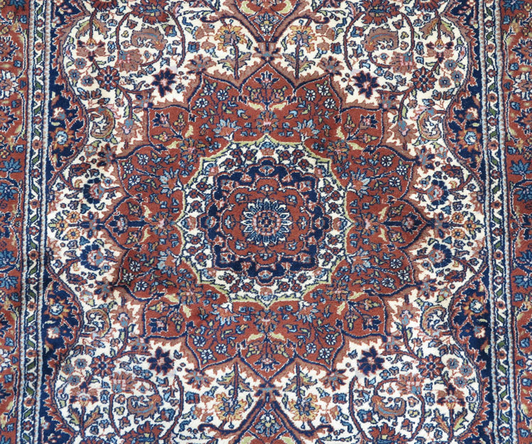 MODERN INDO-PERSIAN HAND KNOTTED WOOL RUG, 4'1'' x 6'1'': The round central medallion in rust orange, medium and light blue is on a white field that is covered with vines connecting leaves, palmettes, and flower heads. There are spandrels hanging from either side of the medallion as well as ones in the corners of the field. The well executed design makes for an attractive rug. Condition is good.