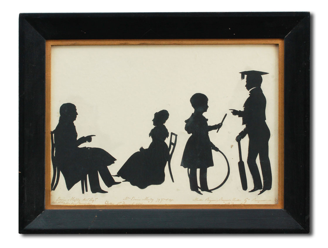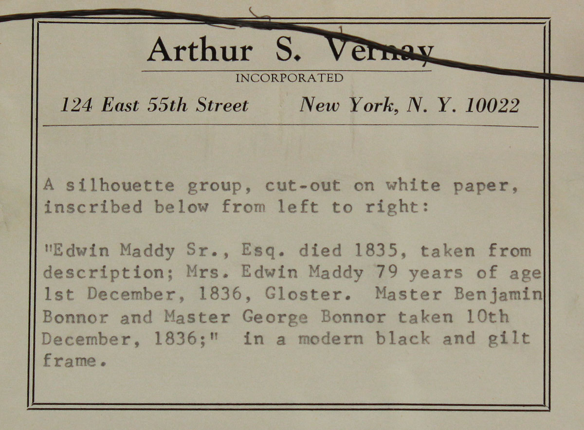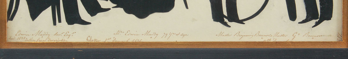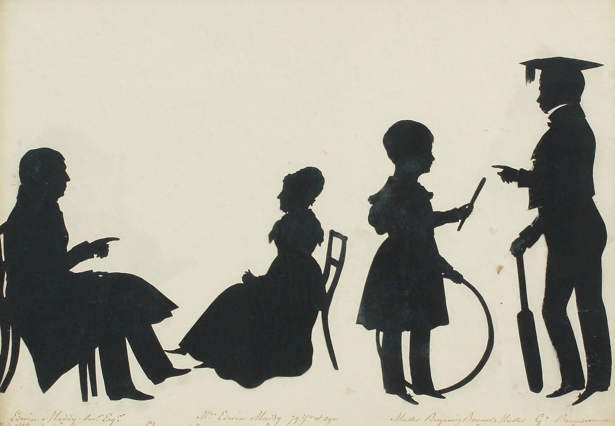19th C. SILHOUETTE GROUPING: Edwin Maddy Sr Esq died 1835, Mrs. Edwin Maddy 1836, and family, sight size 9 3/4'' x 13 3/4'', in black and gilt frame 13 1/4'' x 17 1/4'', label verso from Arthur Vernay NY.