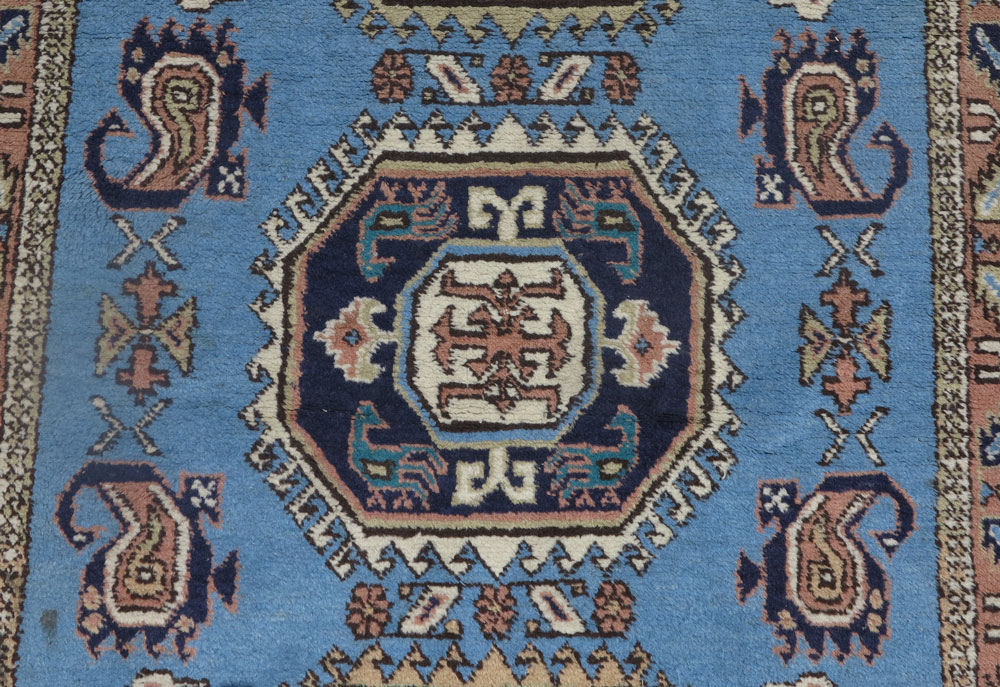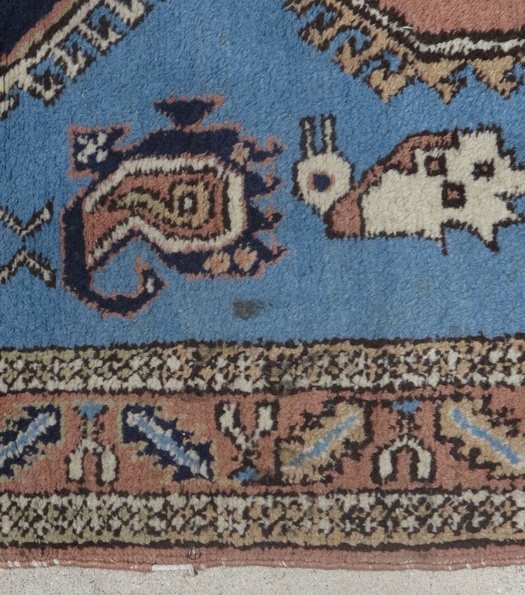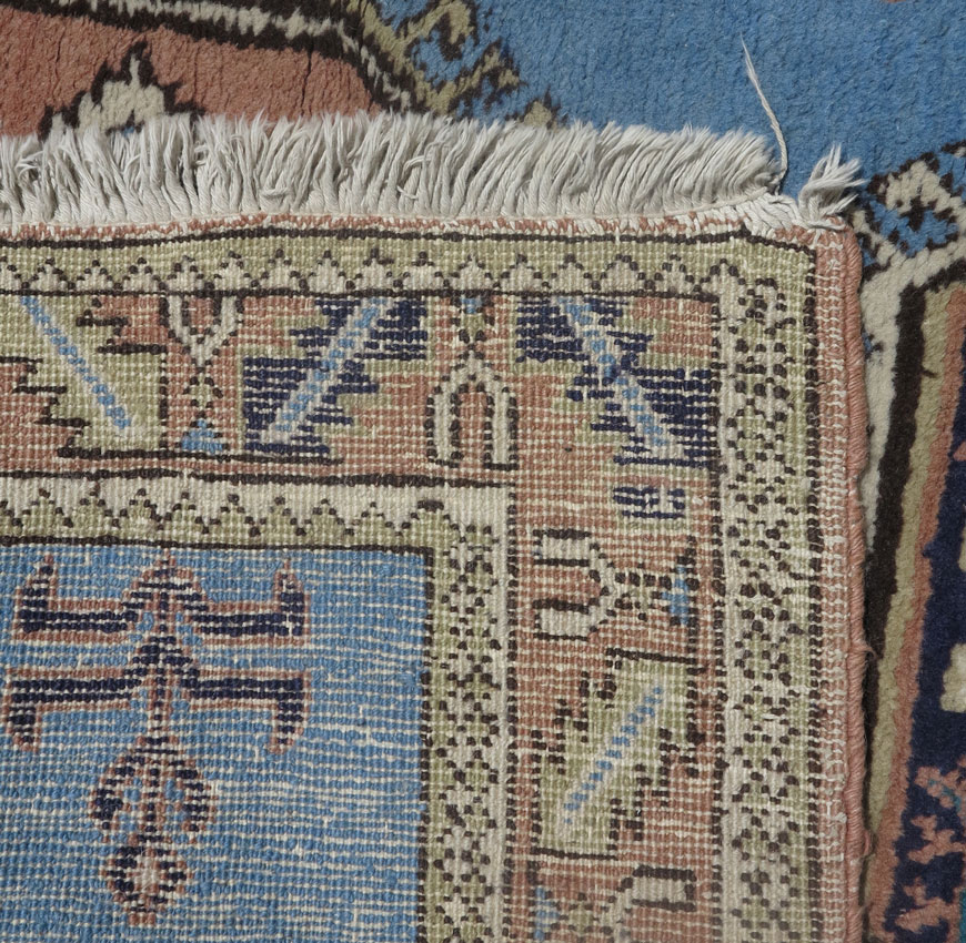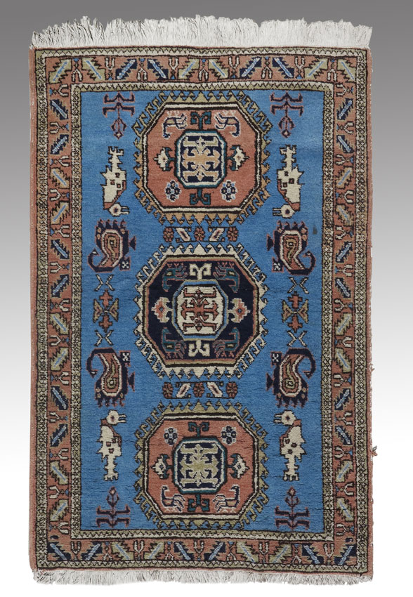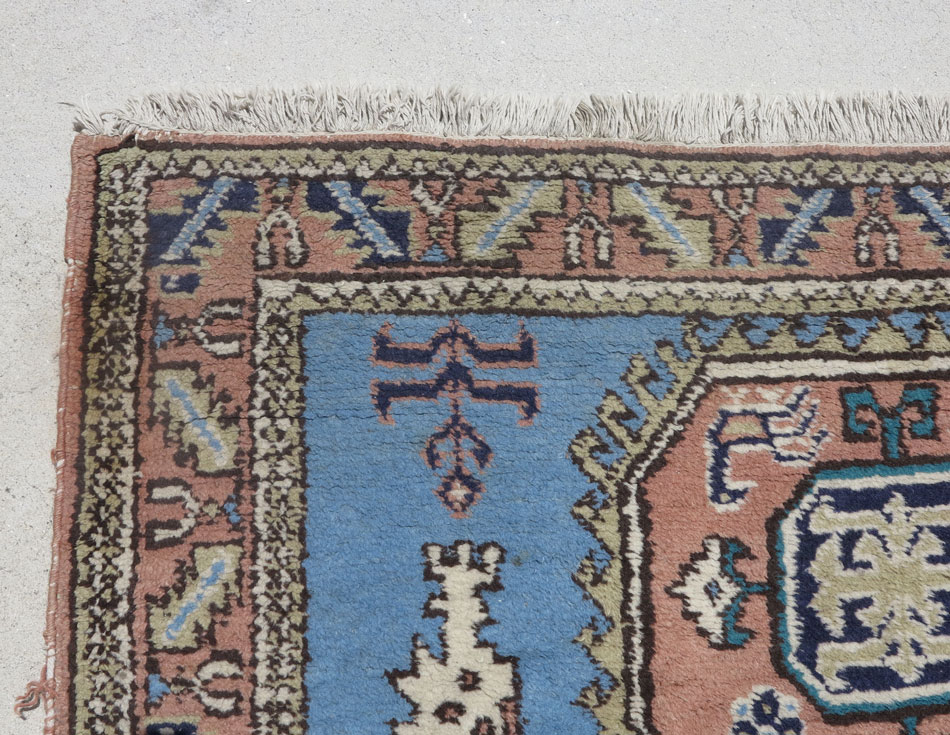 SEMI-ANTIQUE TURKISH HAND KNOTTED WOOL RUG, 4' x 6': This rug has a traditional Bergama design with non-traditional colors. There are three eight sided medallions with latch hook borders. Look for small birds in the medallions. Also of interest are the four paisleys on the sides of the field and the motifs that look like seahorses. The main border has a serrated leaf and wine glass border that is found on rugs from Turkey, The Caucasus, and northern Iran. This is an interesting, good looking rug.