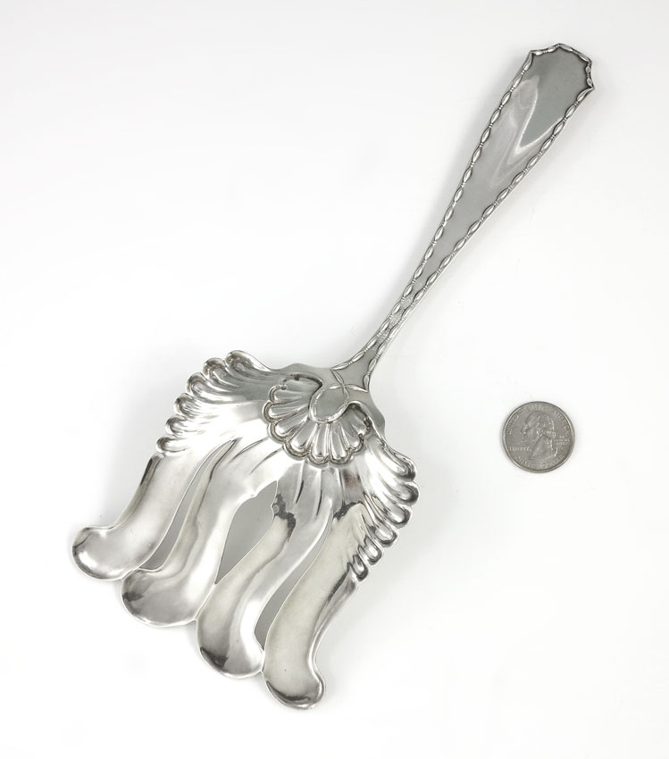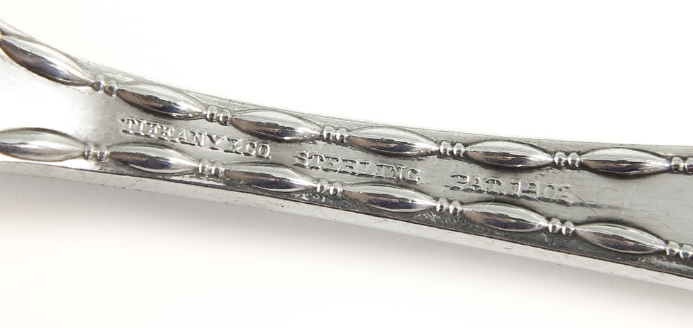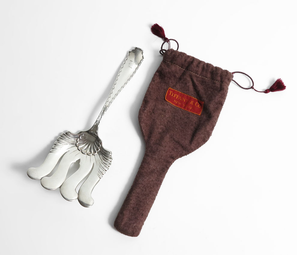 TIFFANY MARQUISE STERLING ASPARAGUS FORK: Marked Tiffany & Co., Sterling, Pat. 1902. 9 1/2'' l., monogrammed. Sold with original Tiffany cover bag. Approx. 4.7 troy oz.