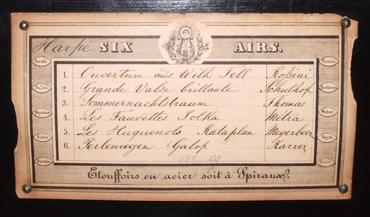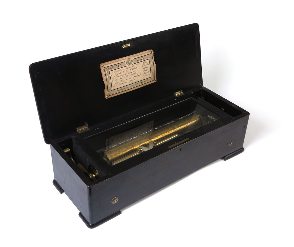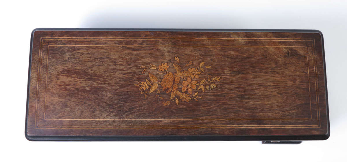 SWISS INLAID CYLINDER ROLL MUSIC BOX: Inlaid case with floral motif. 6 song roll, combs have perfect teeth. Original lithograph listing songs inside lid. Movement unmarked as to maker. Key to lock in case. 6 1/2'' h. x 22 1/2'' x 8 3/4''.