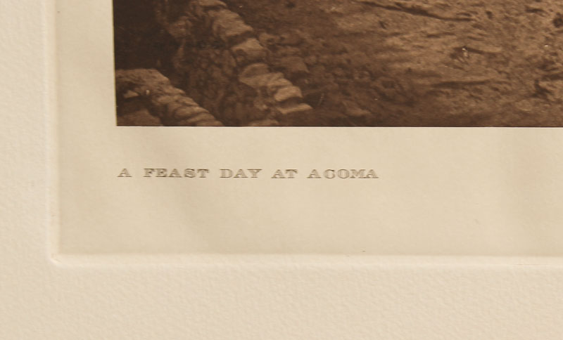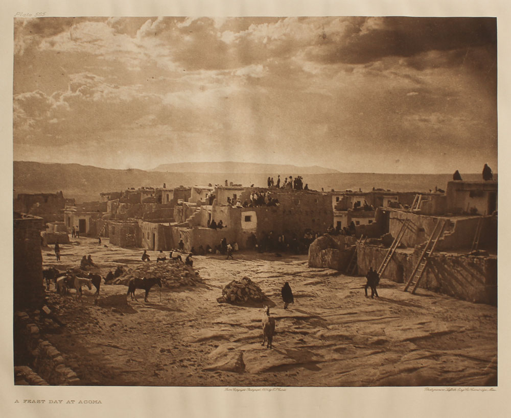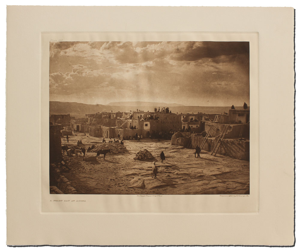 CURTIS, Edward, (American, 1868-1952): ''A Feast Day at Acoma'', Photogravure, 18'' x 22'' with margins, #'d in the plate, plate 565 upper left, titled lower left, noted lower right Photogravure, Sussex England Company, Cambridge Mass, and in the margin from copyright photograph 1904 by E.S. Curtis printed on Arches Paper, unframed. Finely printed from the original plate in 1982 by master printmaker, author and teacher Deli Sacilotto, edition size less than 15.