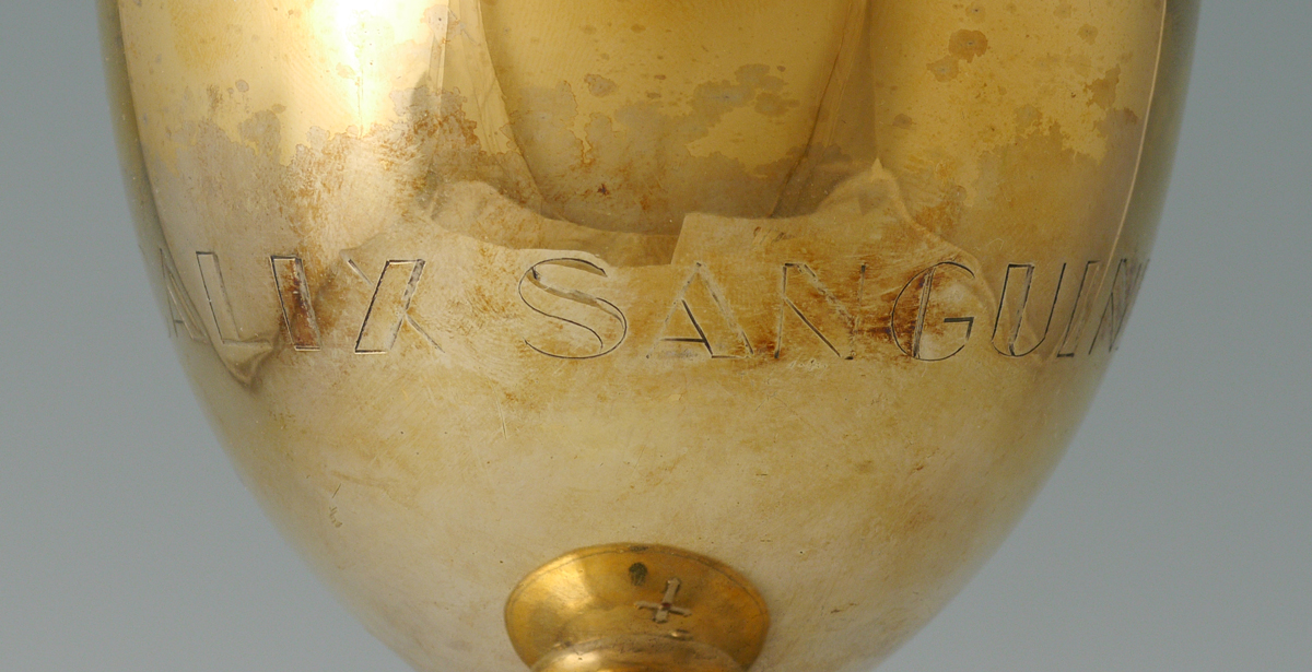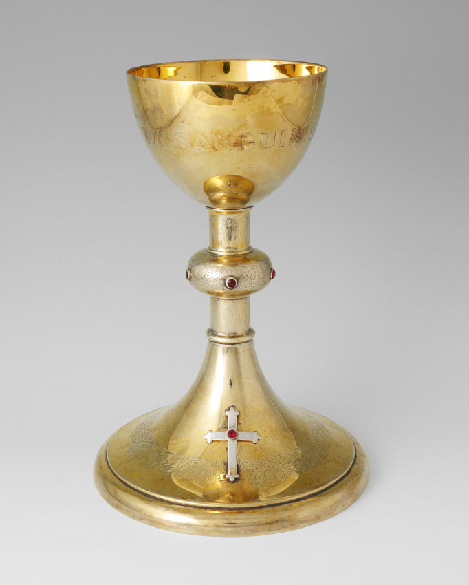 VERMEIL STERLING RELIGIOUS CHALICE: Vermeil finish over sterling chalice with engraved and applied decoration. Engraved dedication on base. Unmarked as to maker or silver content. Measures 8 1/2'' h. x 5 7/8''. Approx. 15.7 troy oz.