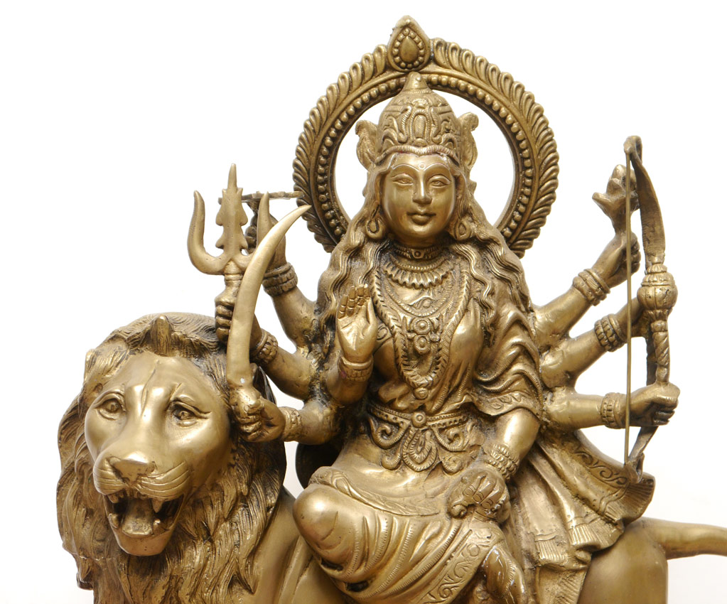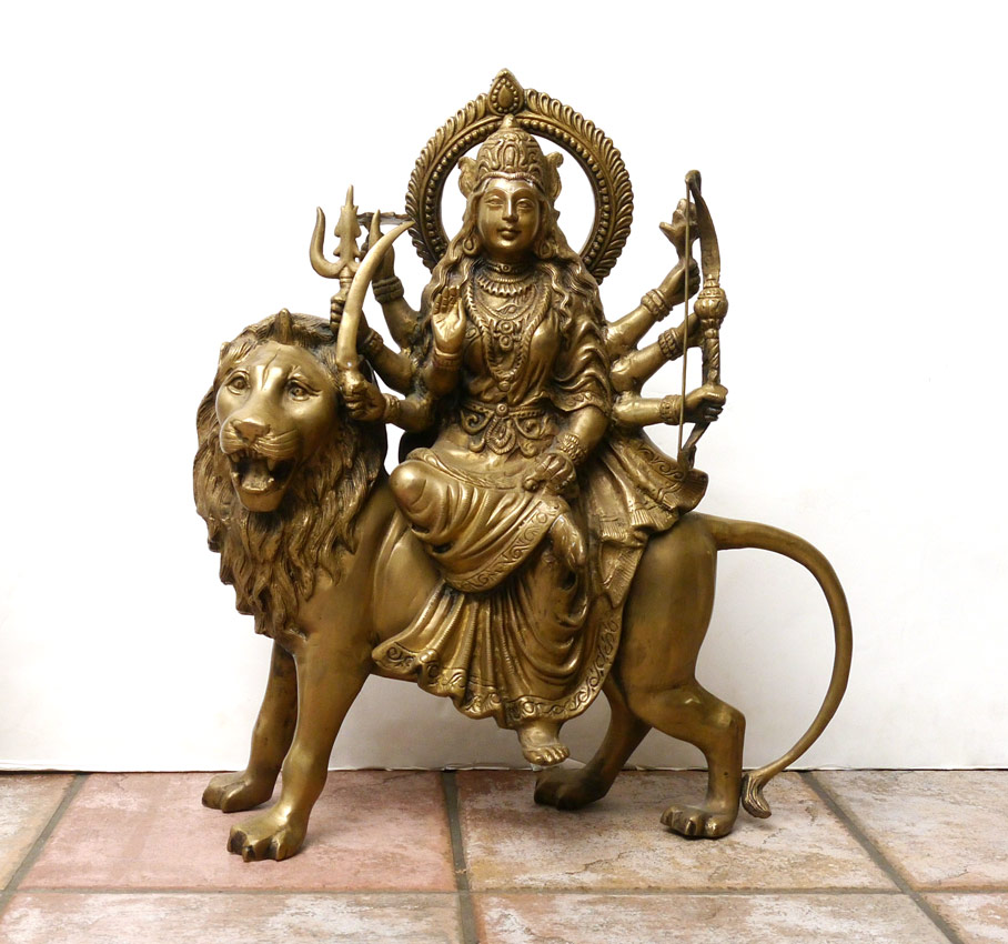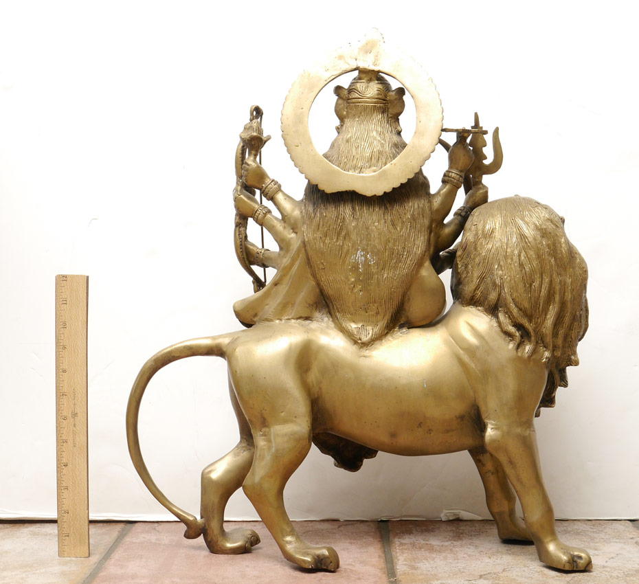 BRONZE INDIAN FIGURE OF DURGA ON LION: Figure of Hindu goddess Durga riding a lion. Age unknown. 22 3/4'' h. x 20 1/2'' x 7''.