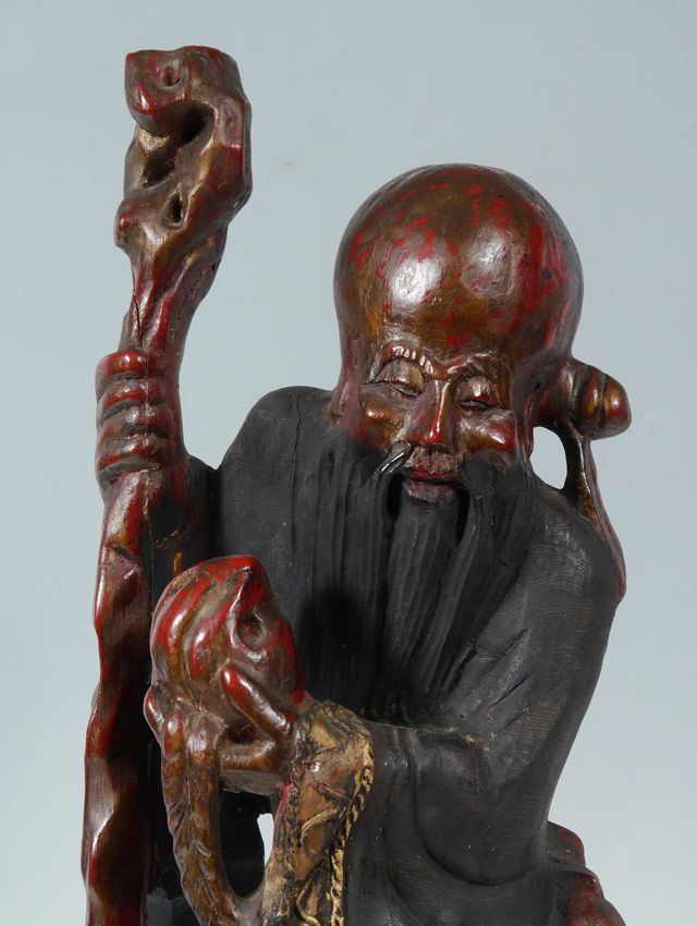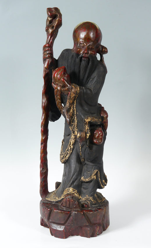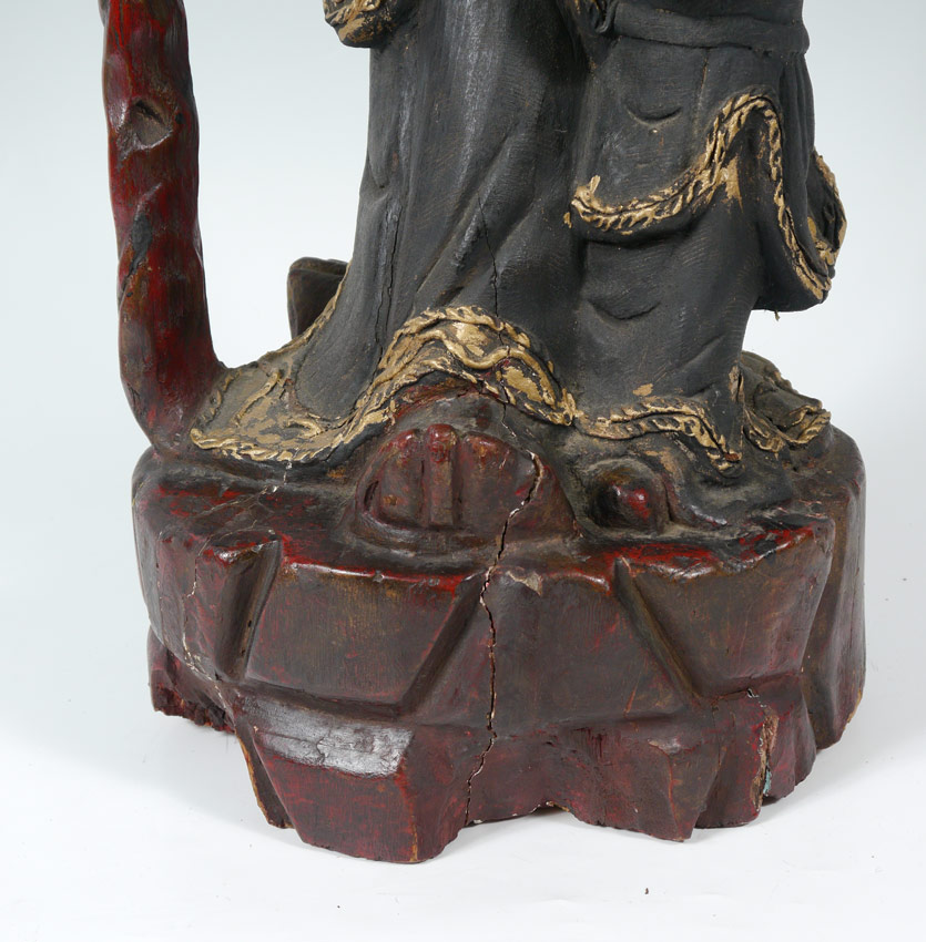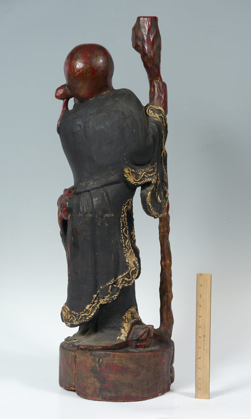 CARVED WOOD BUDDHA CHINESE FIGURE: Red and black paint decoration. Measures approx. 17'' tall, 11'' dia.