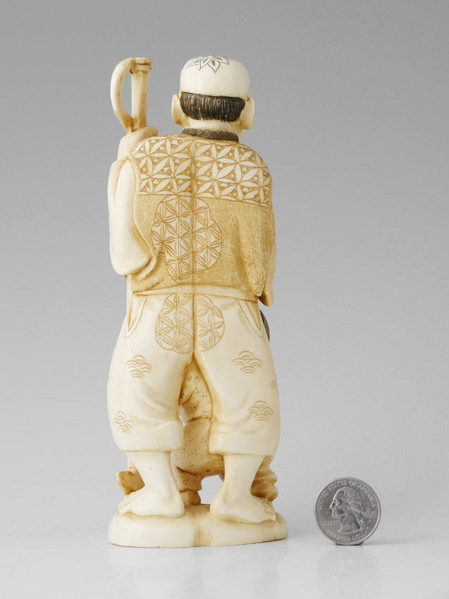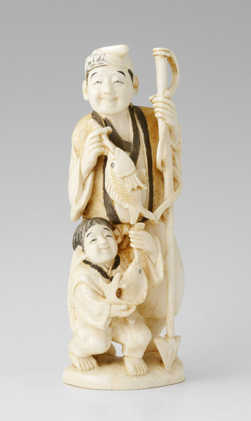 JAPANESE CARVED IVORY FIGURAL GROUP: Carved grouping of a man holding a fishing spear and a fish, with a small child holding a fish. Signed on base. 7 1/8'' h.