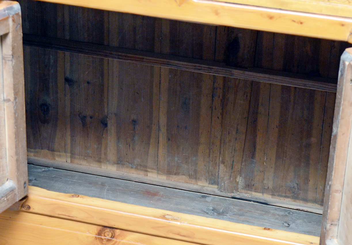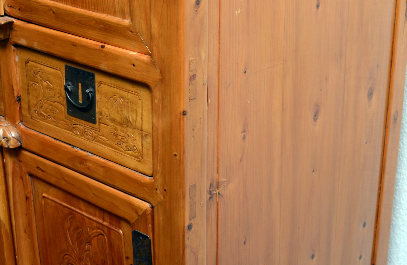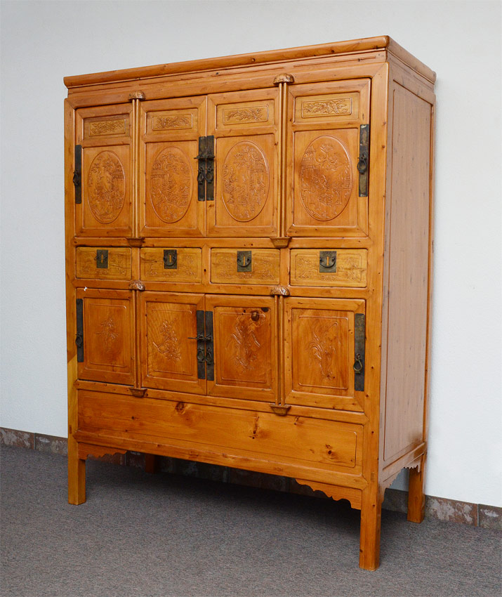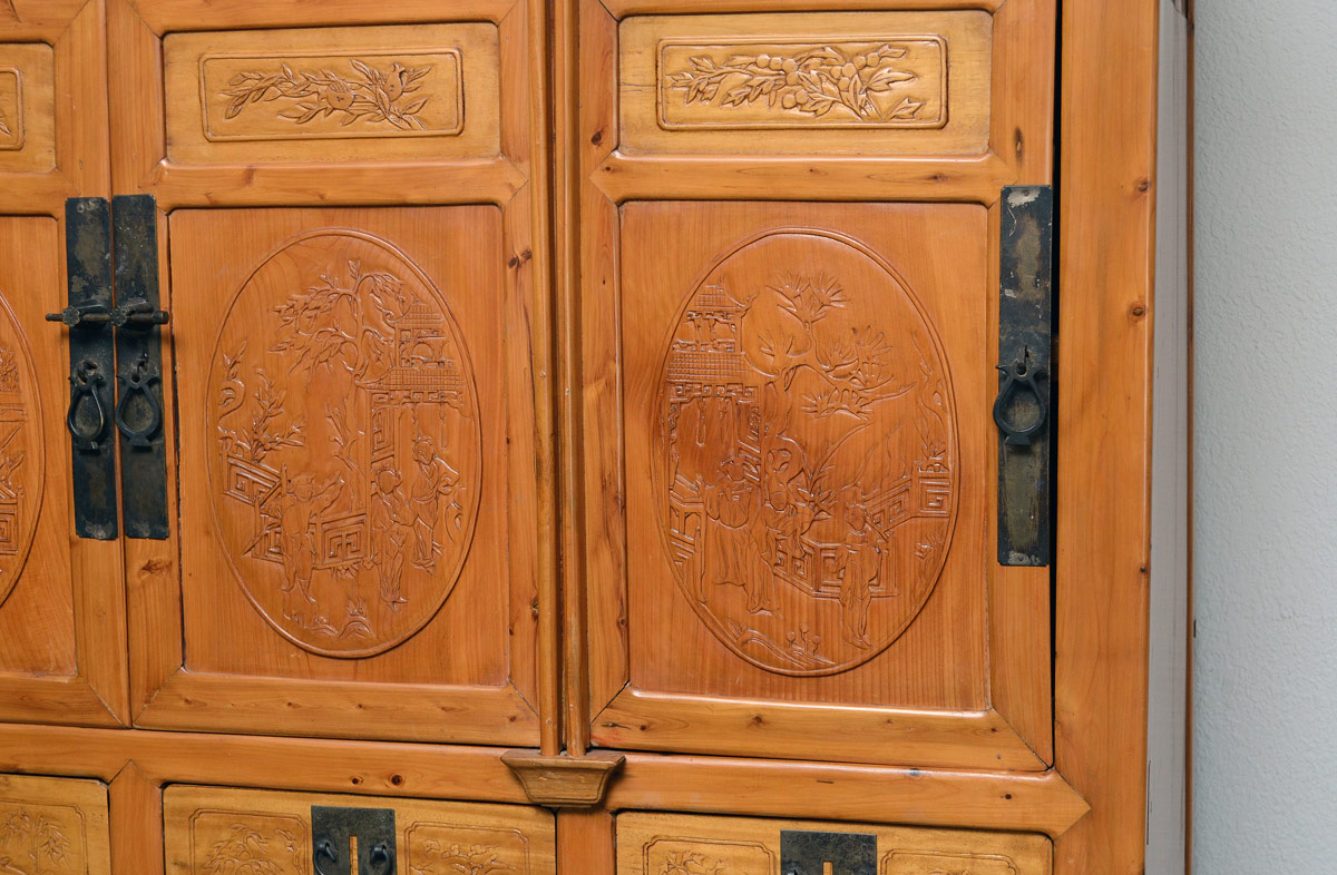 LARGE CARVED ORIENTAL CHEST: 4 doors over 4 drawers over another 4 doors, each with carved panels. Through tenon construction. Carved skirt. Measures 70 1/2'' h. x 55 1/4'' x 22 1/4''.