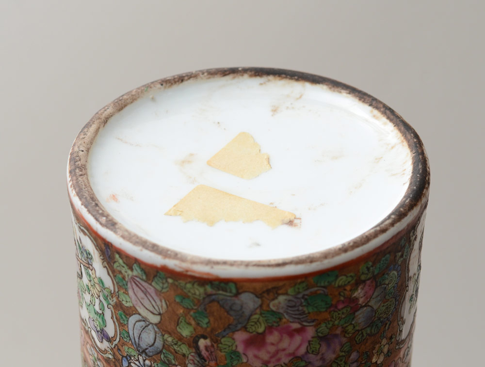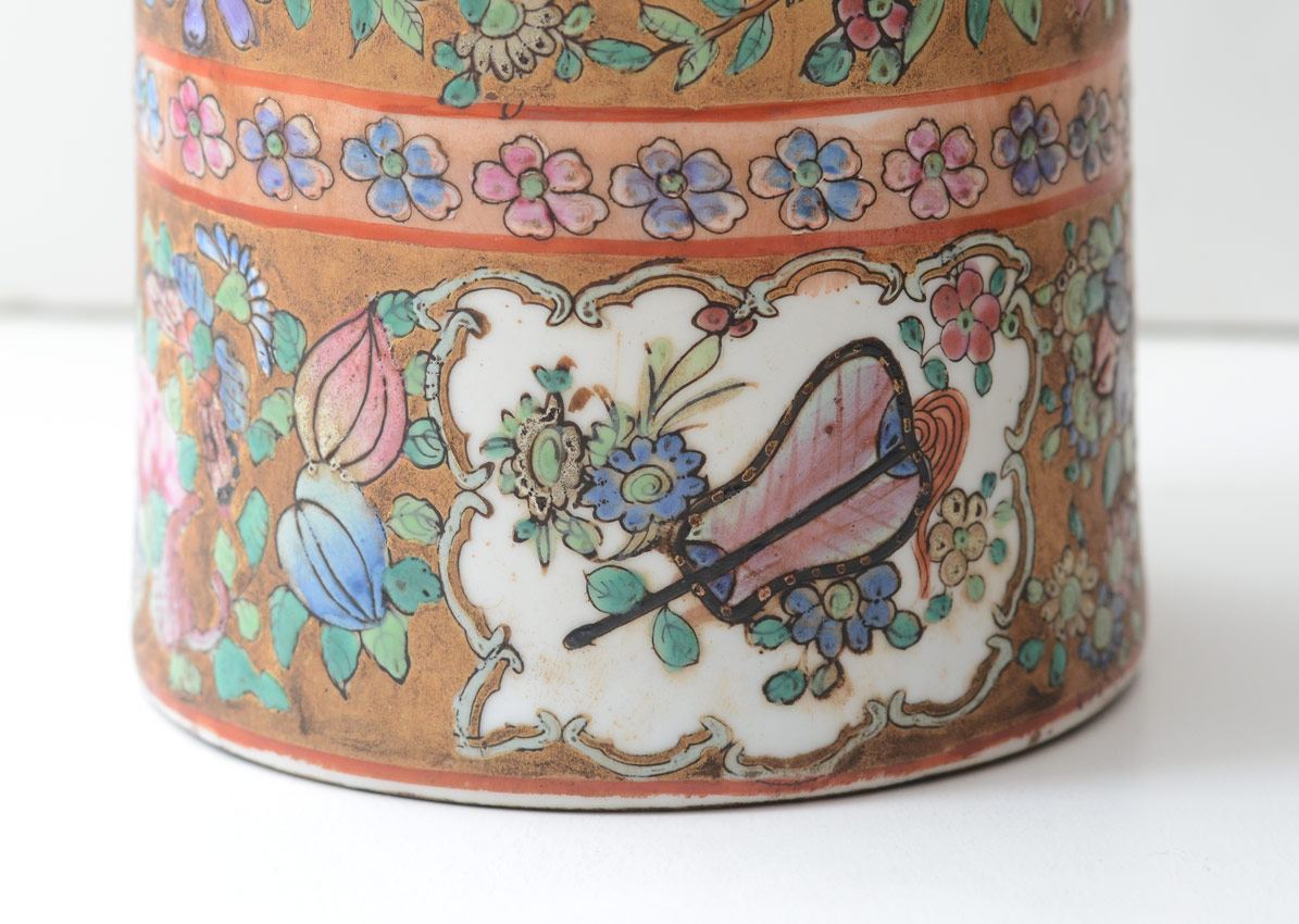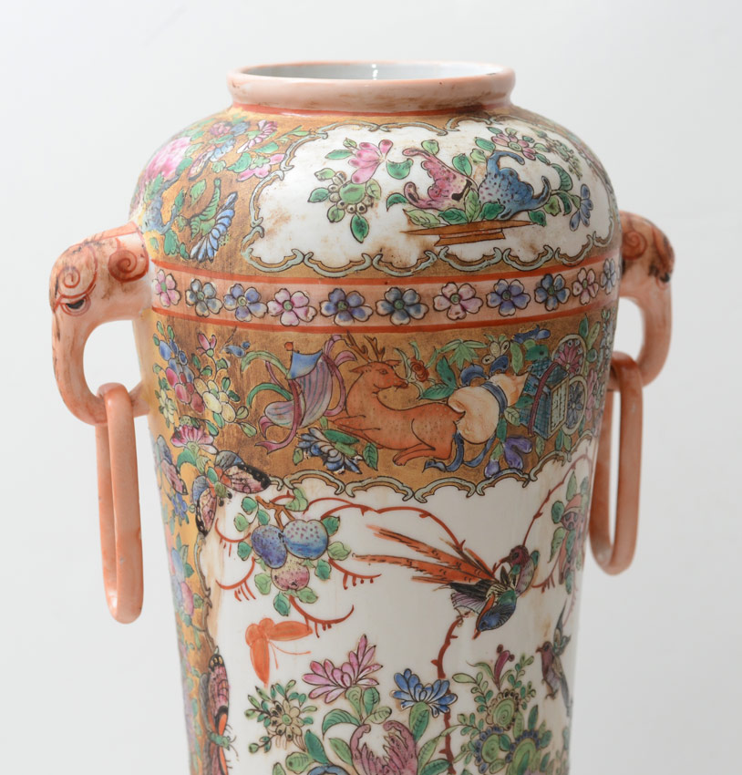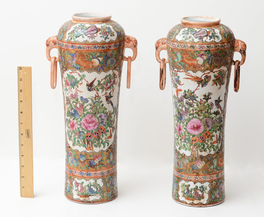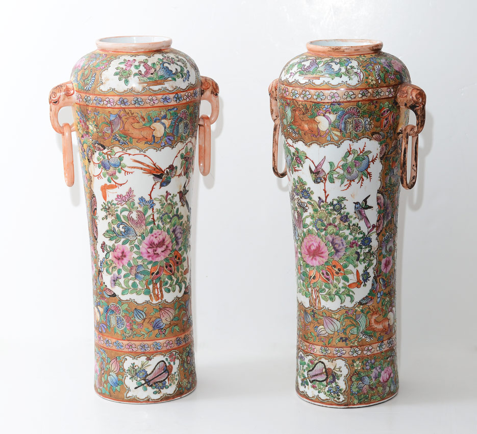 PAIR FAMILLE ROSE ORIENTAL VASES: Incised and polychrome floral and animal motifs. Elephant form handles with reticulated rings. Actual age unknown. 16 1/2'' h. x 8 1/4''.