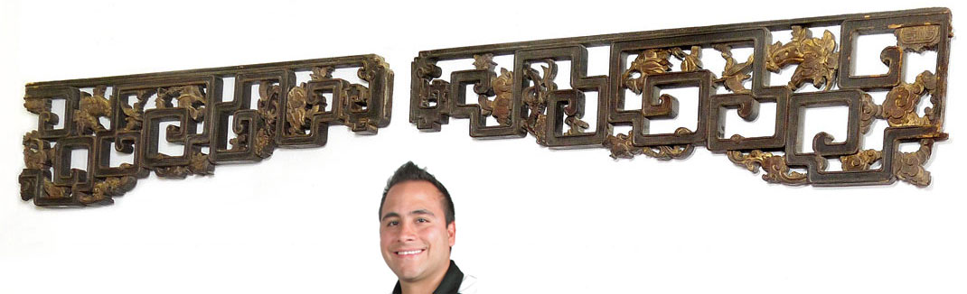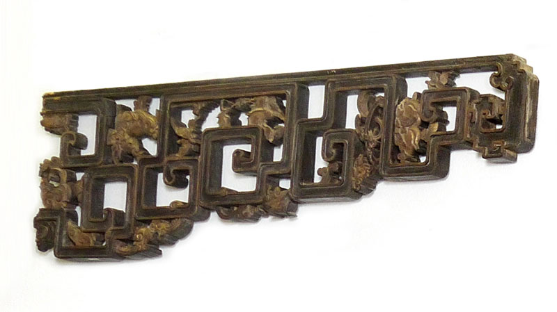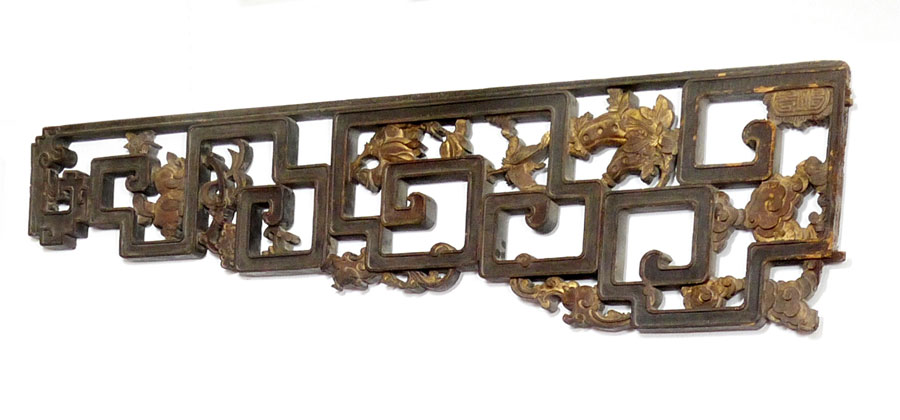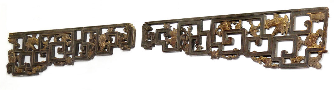 2 CARVED CHINESE VALENCE PANELS: Carved and shaped with gilt decorated floral and fruit motifs. 20 1/2'' h. x 78 1/2'' l.