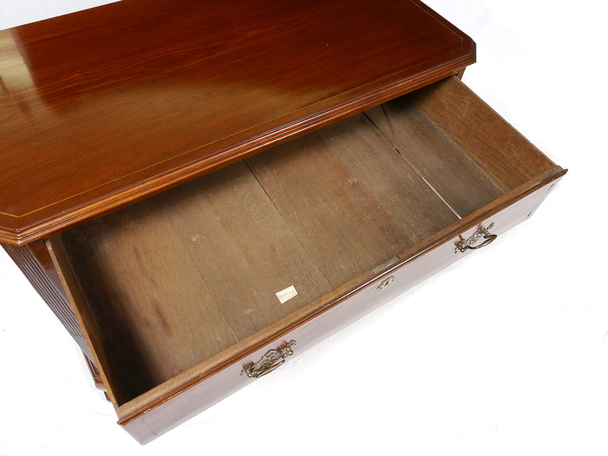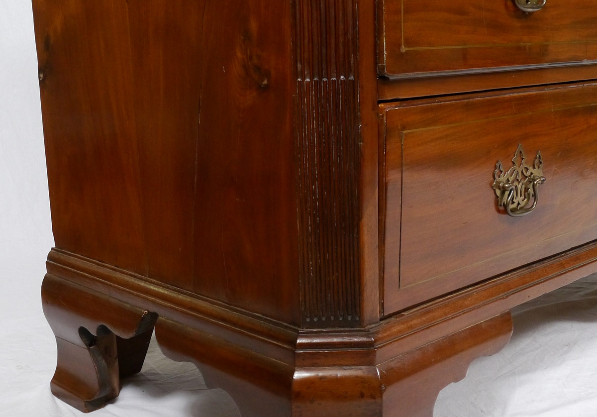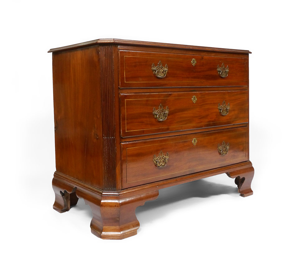 EARLY MAHOGANY 3 DRAWER CHEST: String inlay top and drawer fronts, 3 graduated drawers with pierced bat wing pulls. Canted reeded corners. On shaped ogee bracket feet. 35'' h. x 43 1/2'' x 22 1/4''.