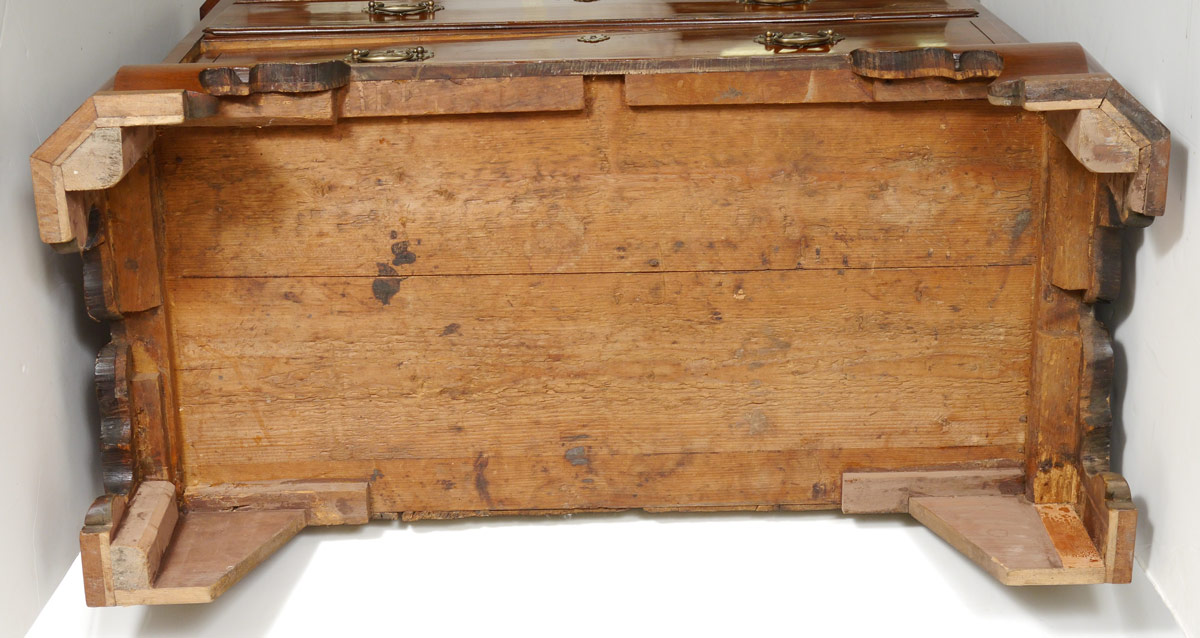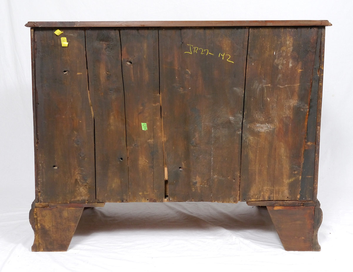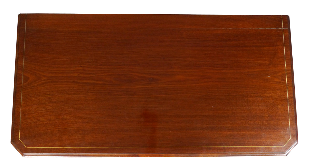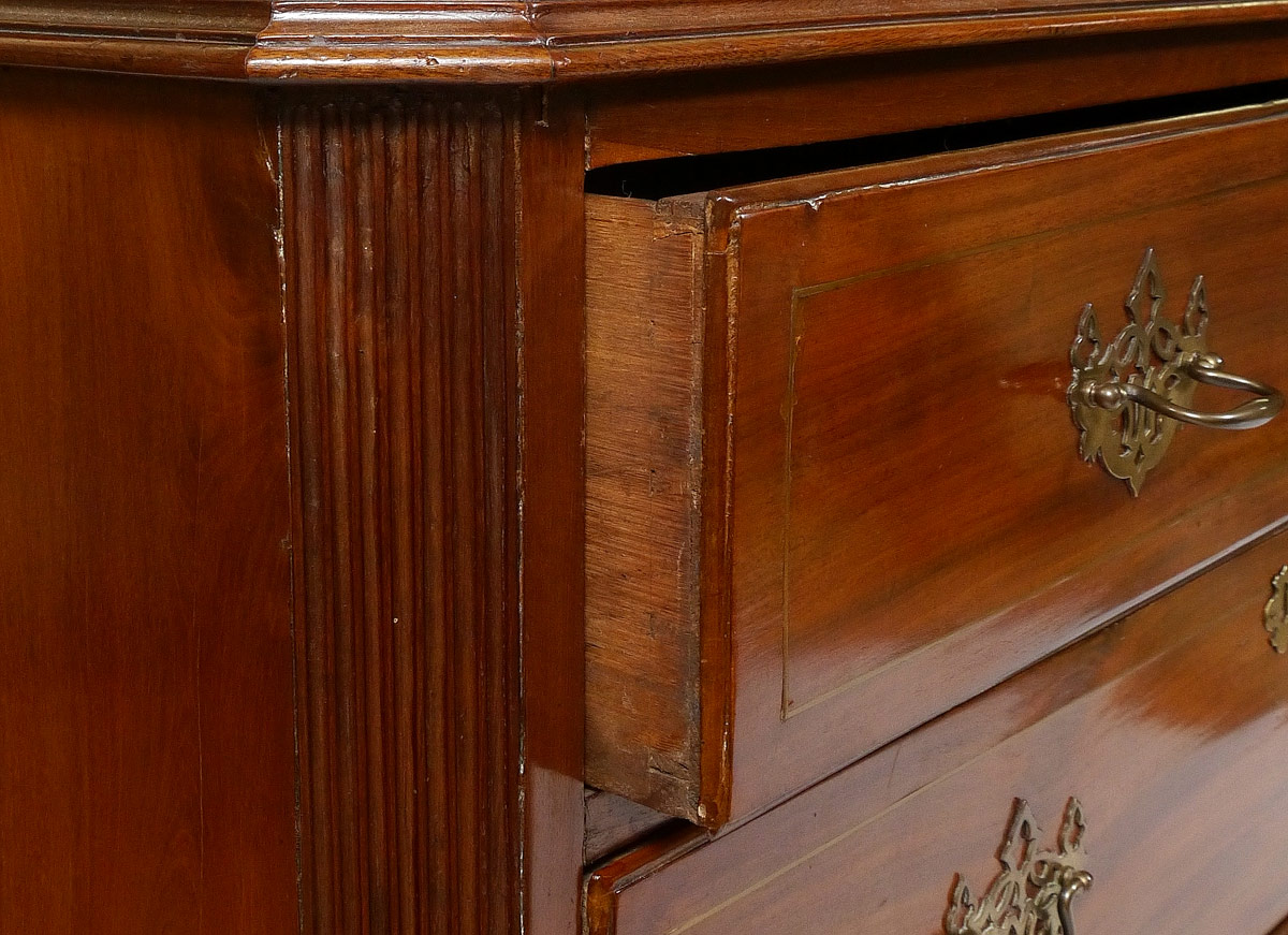 EARLY MAHOGANY 3 DRAWER CHEST: String inlay top and drawer fronts, 3 graduated drawers with pierced bat wing pulls. Canted reeded corners. On shaped ogee bracket feet. 35'' h. x 43 1/2'' x 22 1/4''.