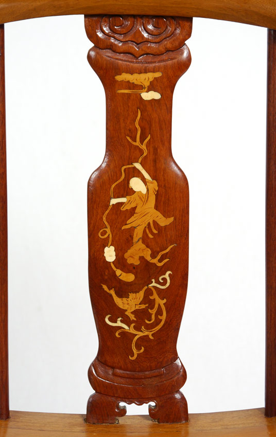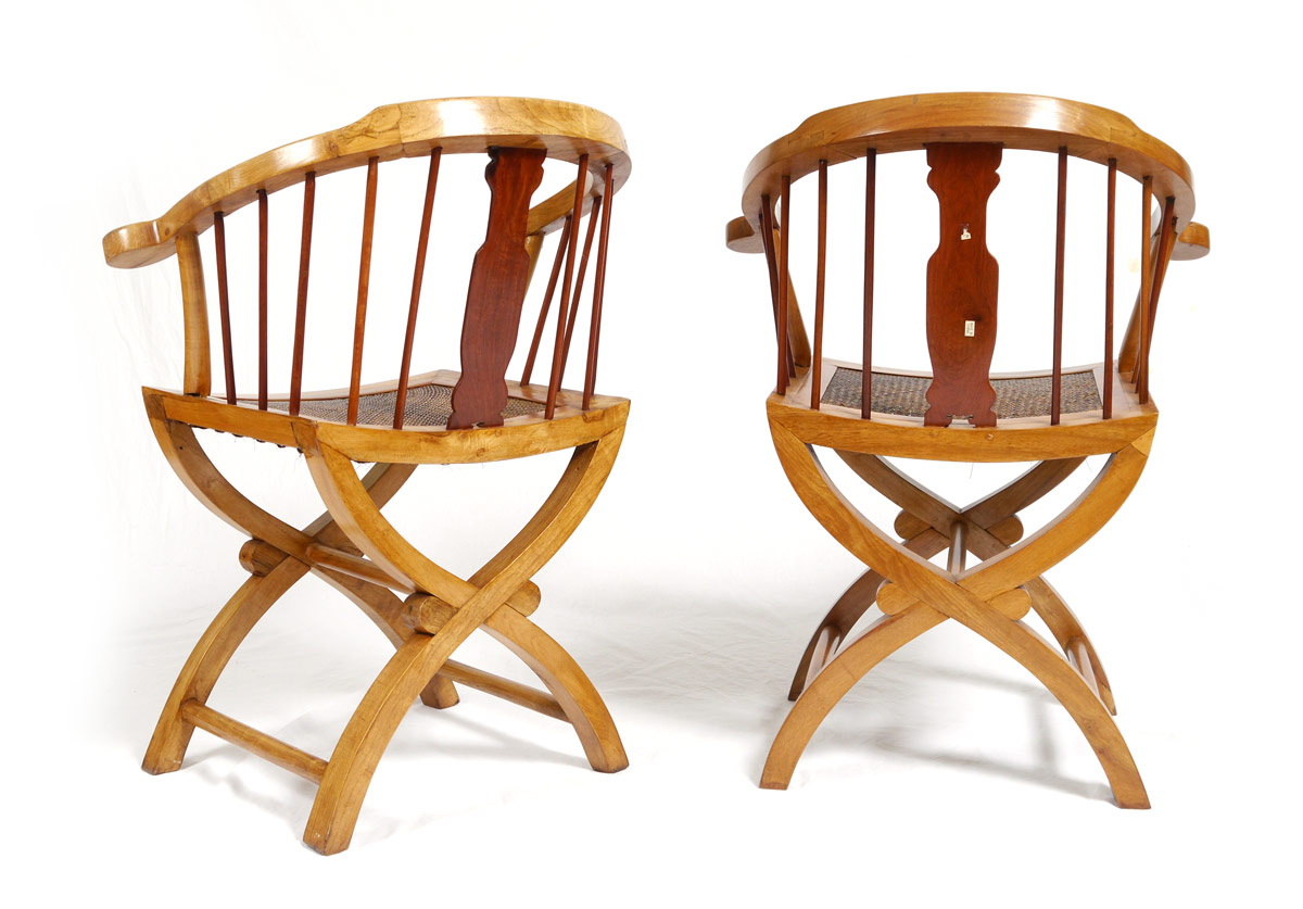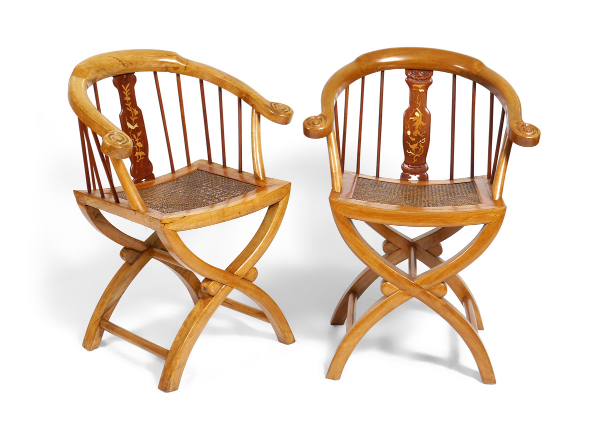PAIR CARVED HORSESHOE BACK OPEN ARM CHAIRS: Each with separate design carved and inlaid back splats, carved hand holds. Woven seats over shaped X frame legs. 34 1/4'' h. x 25'' x 20 1/4''. Age unknown.