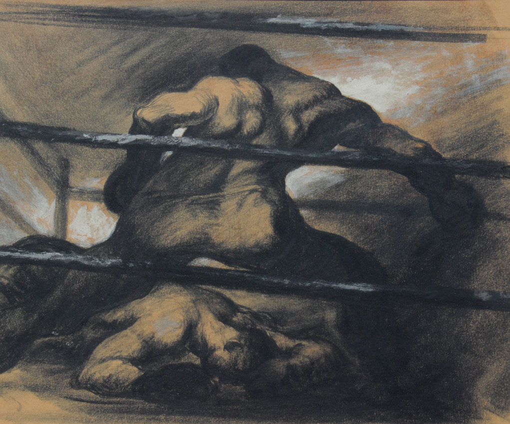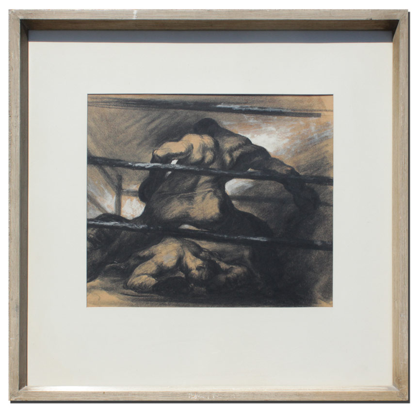 REHBERGER, Gustav, (American, 1910-1995): Boxing Prize Fight, Down for the Count, Charcoal/Heightened with White, Sight size 12 1/4'' x 15'', monogrammed lower left, custom frame, 24'' x 25''.