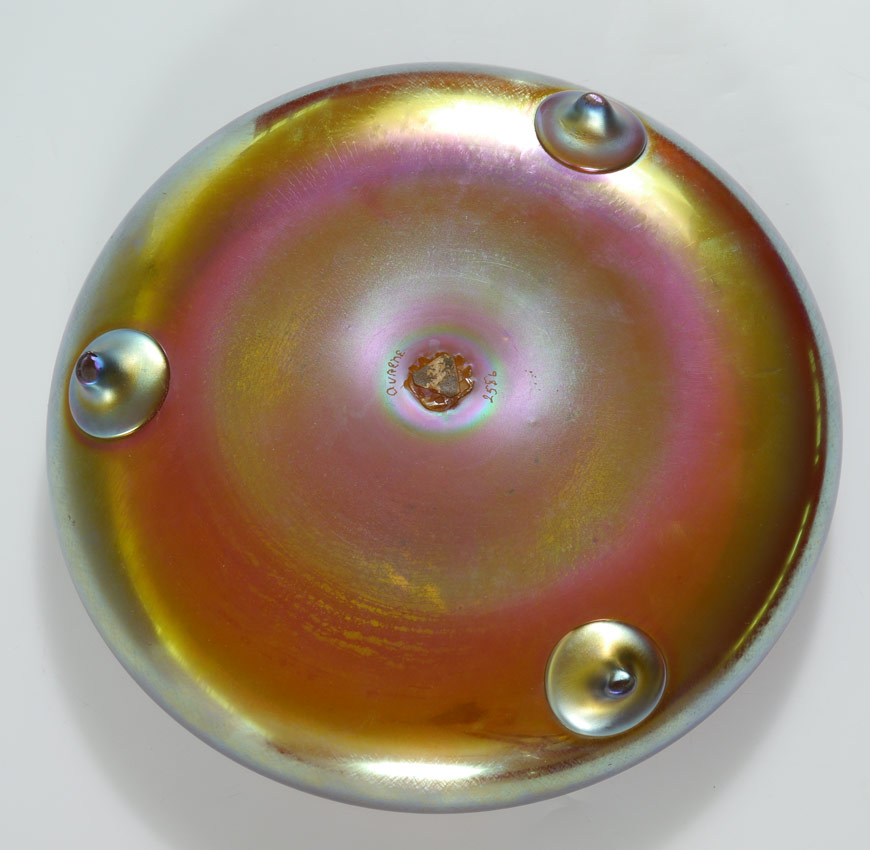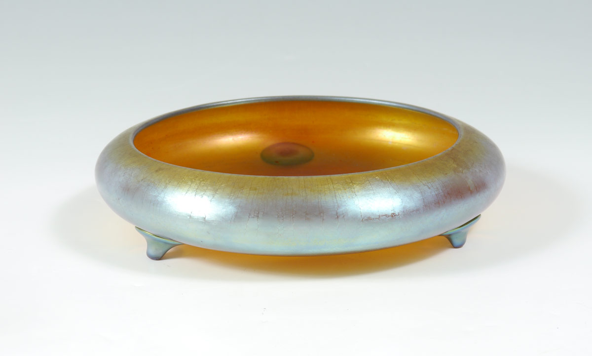 STEUBEN AURENE FOOTED ART GLASS BOWL 2586: Gold iridescent glass. Signed Aurene 2586, 2 1/2'' h. x 10 1/4'' dia.