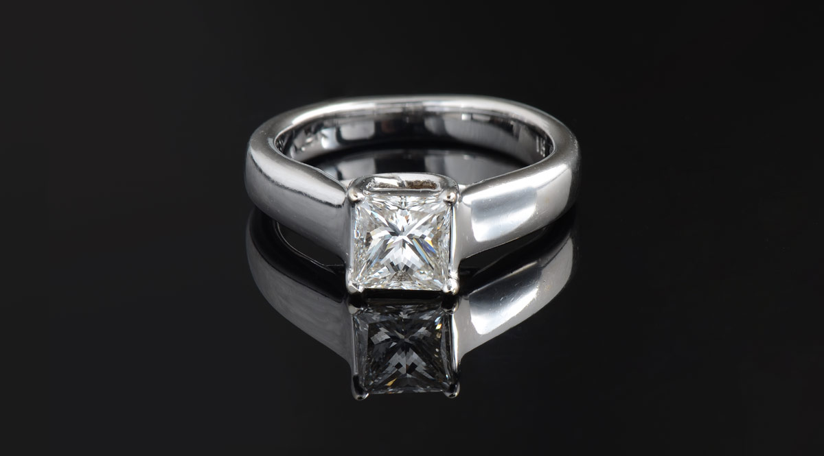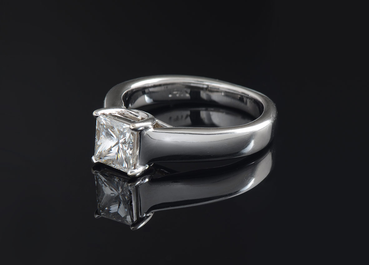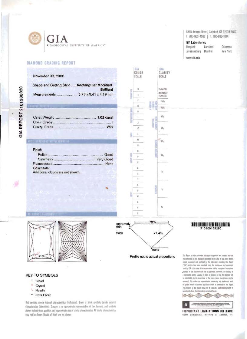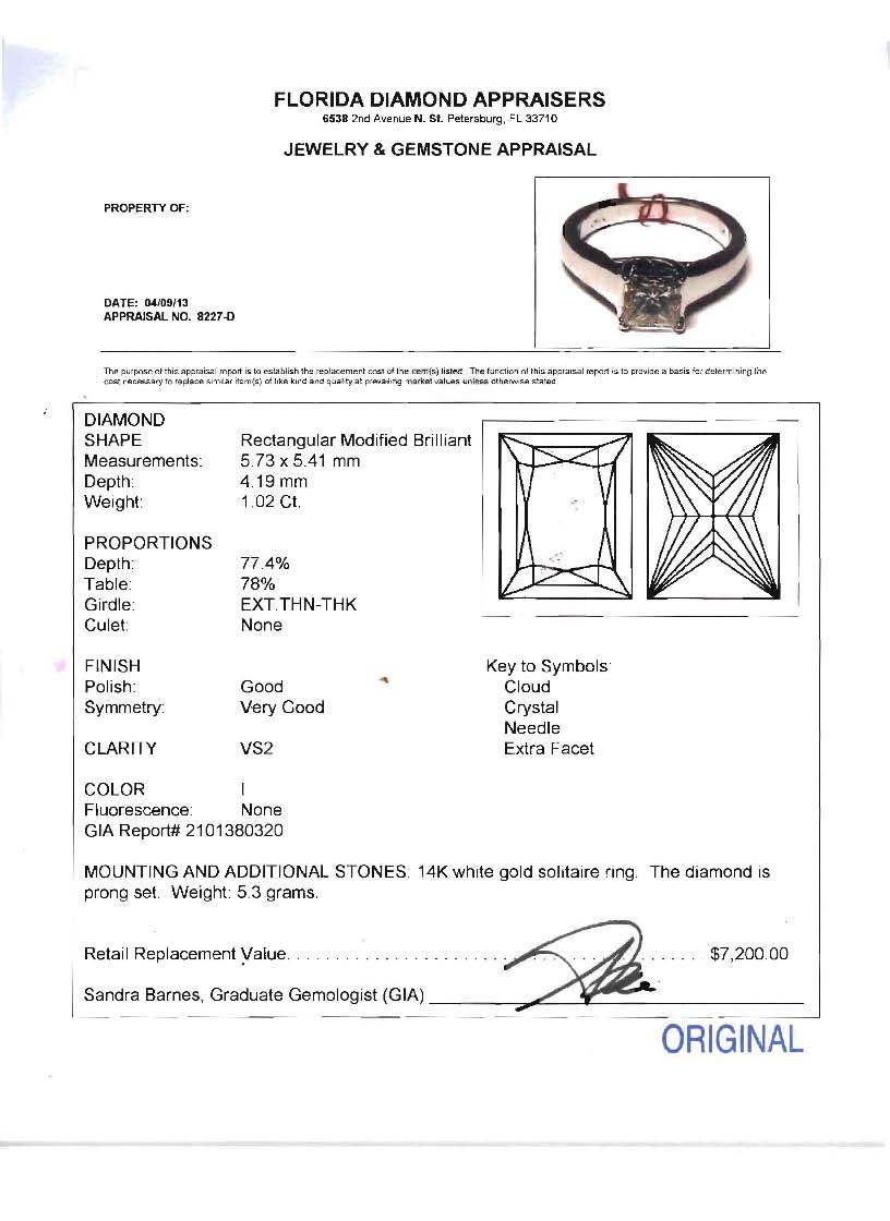 GIA CERTIFIED RECTANGULAR MODIFIED DIAMOND SOLITAIRE: 14K white gold ring centers an approx. 1.02 Ct. diamond of VS2 clarity and I color. GIA report #2101380320. Sold with current Florida Diamond Appraisers GIA graduates appraisal for $7200.