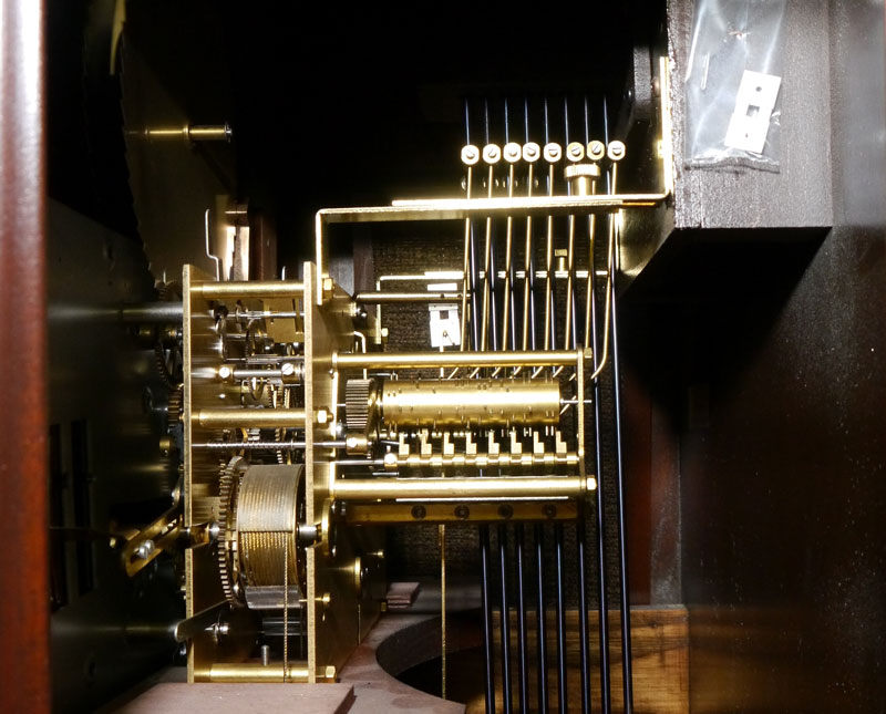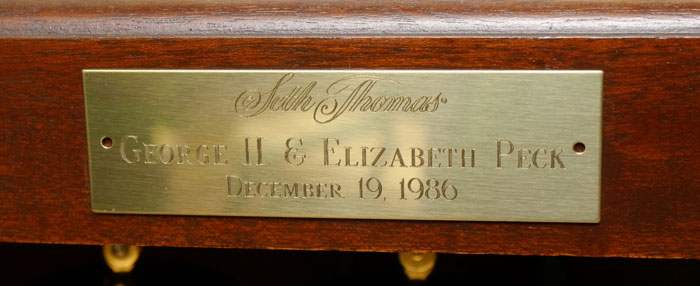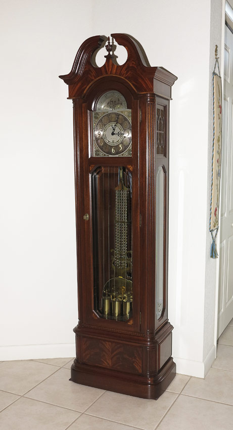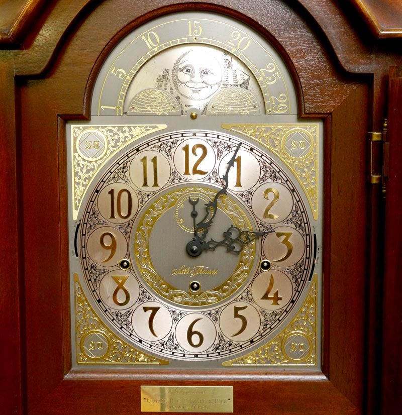 SETH THOMAS MOON PHASE GRANDFATHER CLOCK: Mid 20th century, flame mahogany veneer case. Broken arch pediment with carved finial, mixed metal face with moon phase marked Seth Thomas. Triple chime movement. 84'' h. x 24 1/2'' x 13 3/4''.