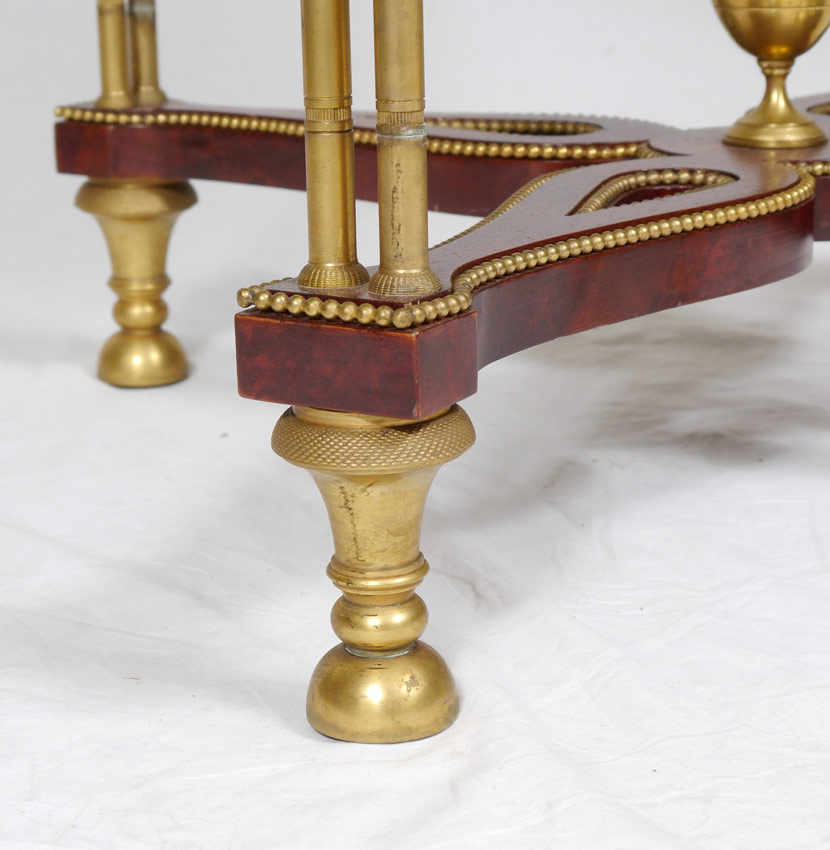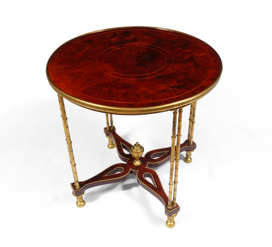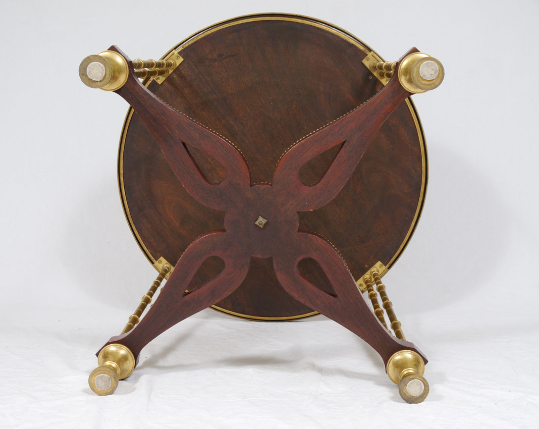 INLAID BURL CIRCULAR SIDE TABLE: Burl veneer top with string inlay, brass column supports. Shaped stretchers with central finial, brass feet. 27 3/4'' h. x 27 1/2'' diameter.
