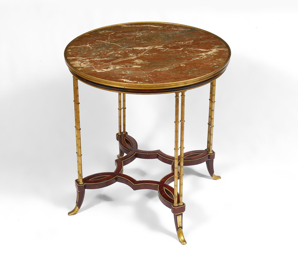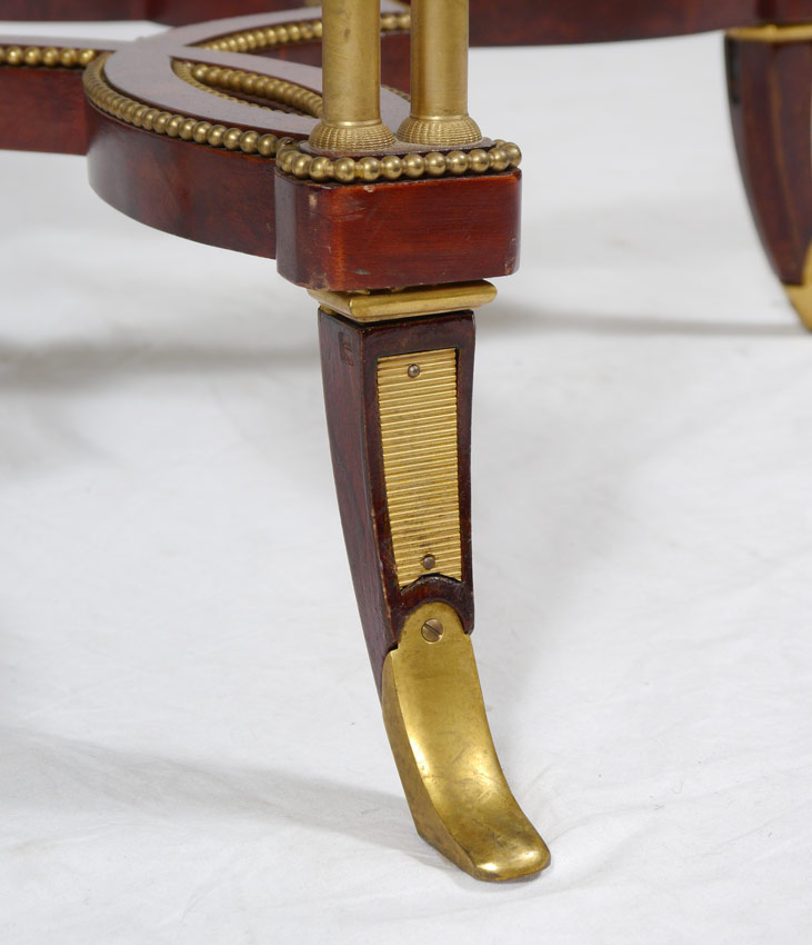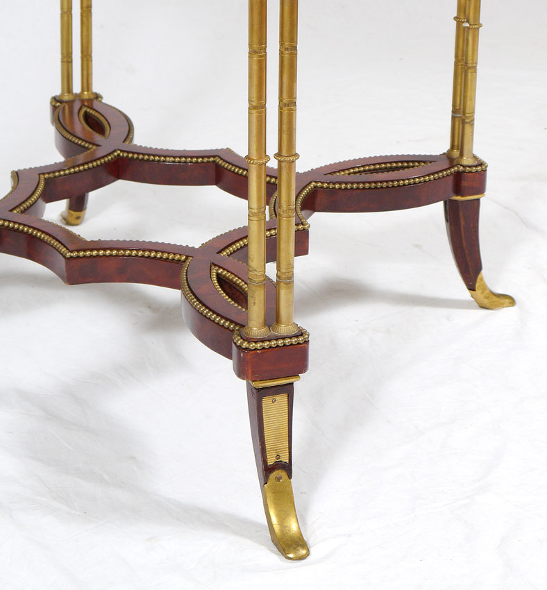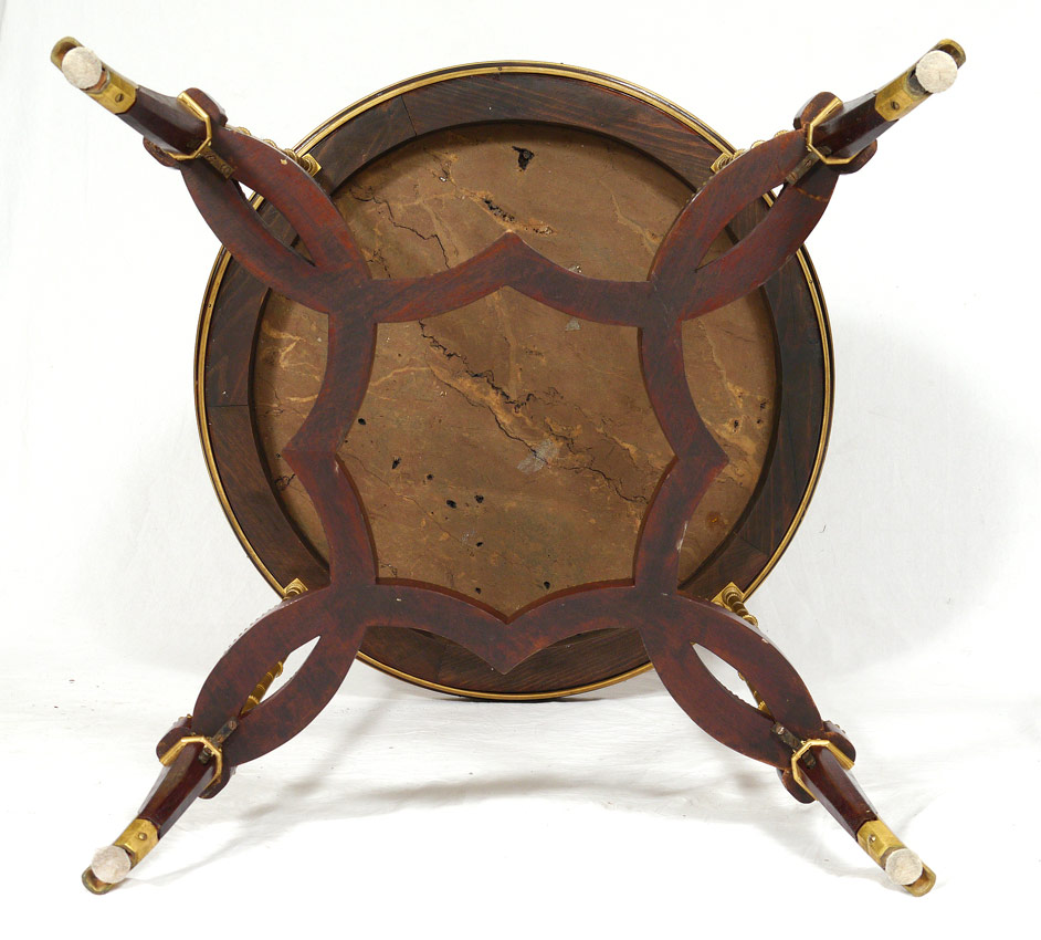 MARBLE TOP CIRCULAR SIDE TABLE: Inset marble top with brass column supports. Shaped stretchers with central finial, brass feet. 29 3/4'' h. x 31 1/2'' diameter.