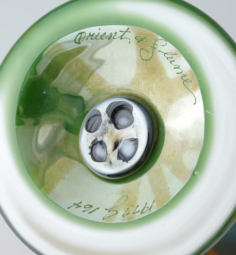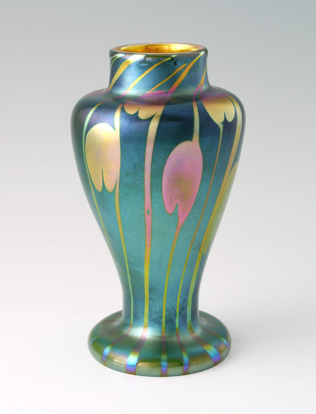ORIENT & FLUME IRIDESCENT BLEEDING HEART VASE: Signed, numbered and dated 1977. 6 1/2'' tall.