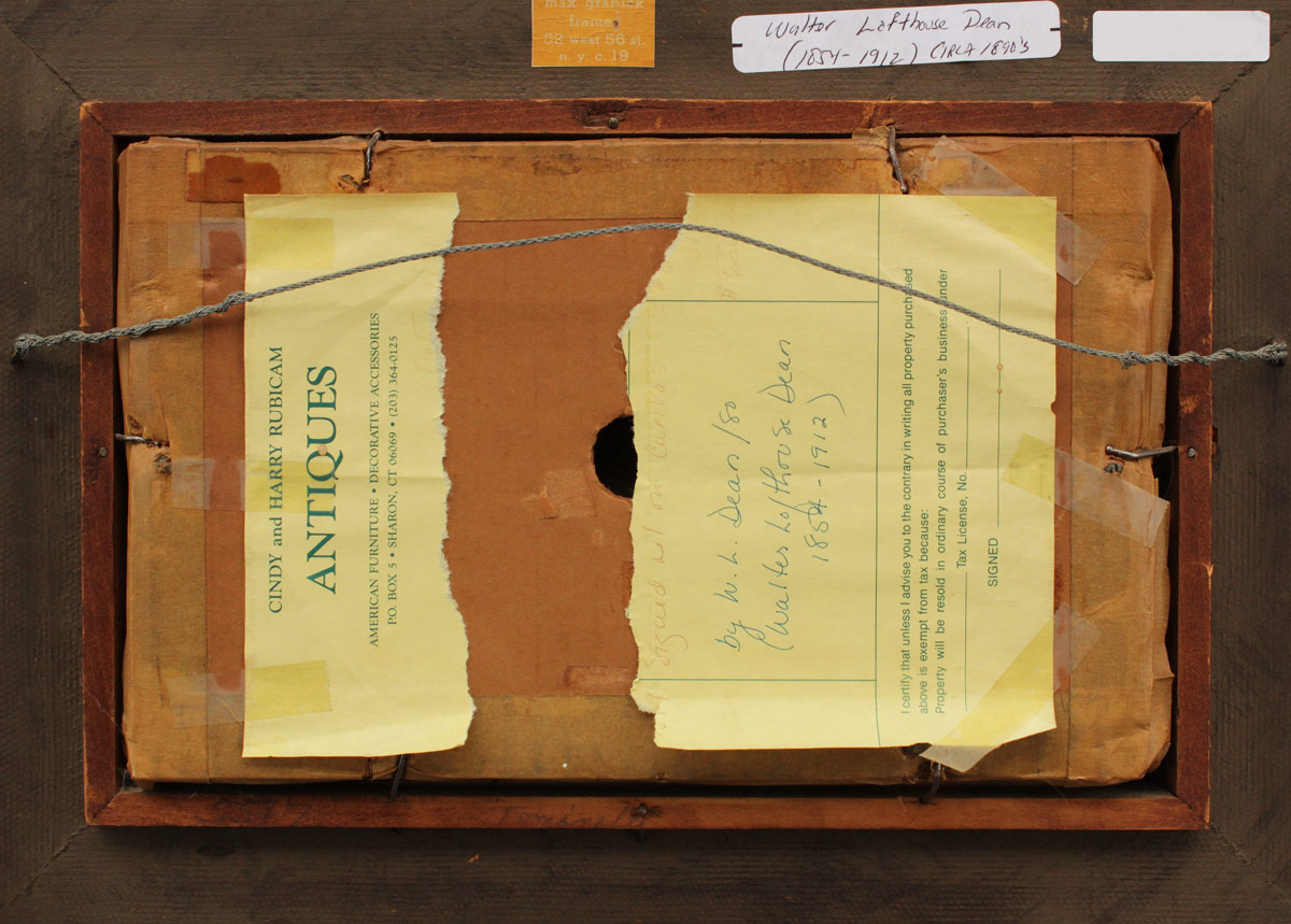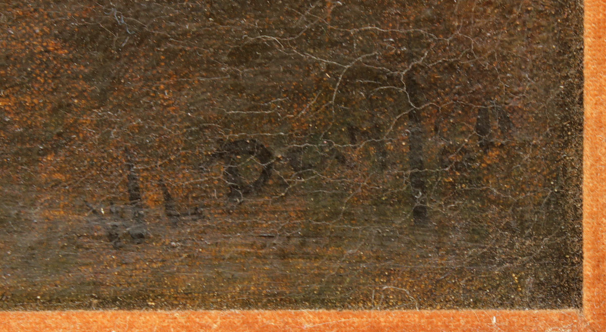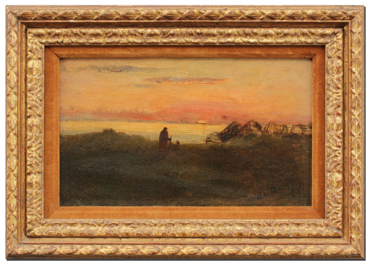 DEAN, Walter Lofthouse, (American, 1854-1912): Figure Walking Along a Coastline with Sunrise in the Distance, Oil/Canvas, 6'' x 10'', signed lower right, dated '80, gilded frame with minor wear, 9 1/2'' x 14''.