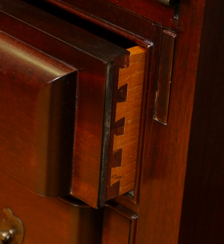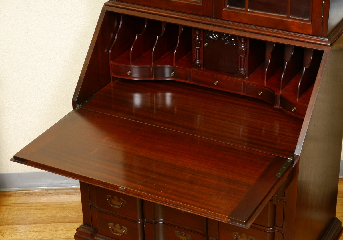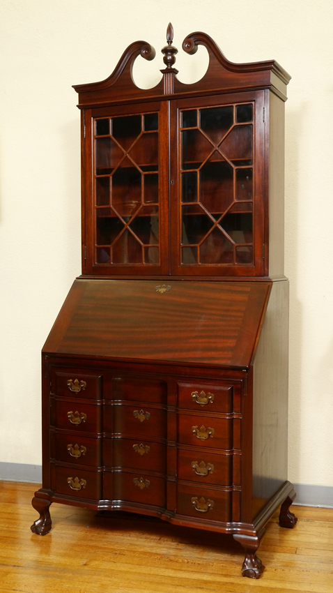 MADDOX CHIPPENDALE STYLE BLOCK FRONT SECRETARY: Two part mahogany secretary. The bottom being a slant front desk with fitted interior. The upper being a glass door bookcase. Approx. 84'' tall x 36'' x 21''.
