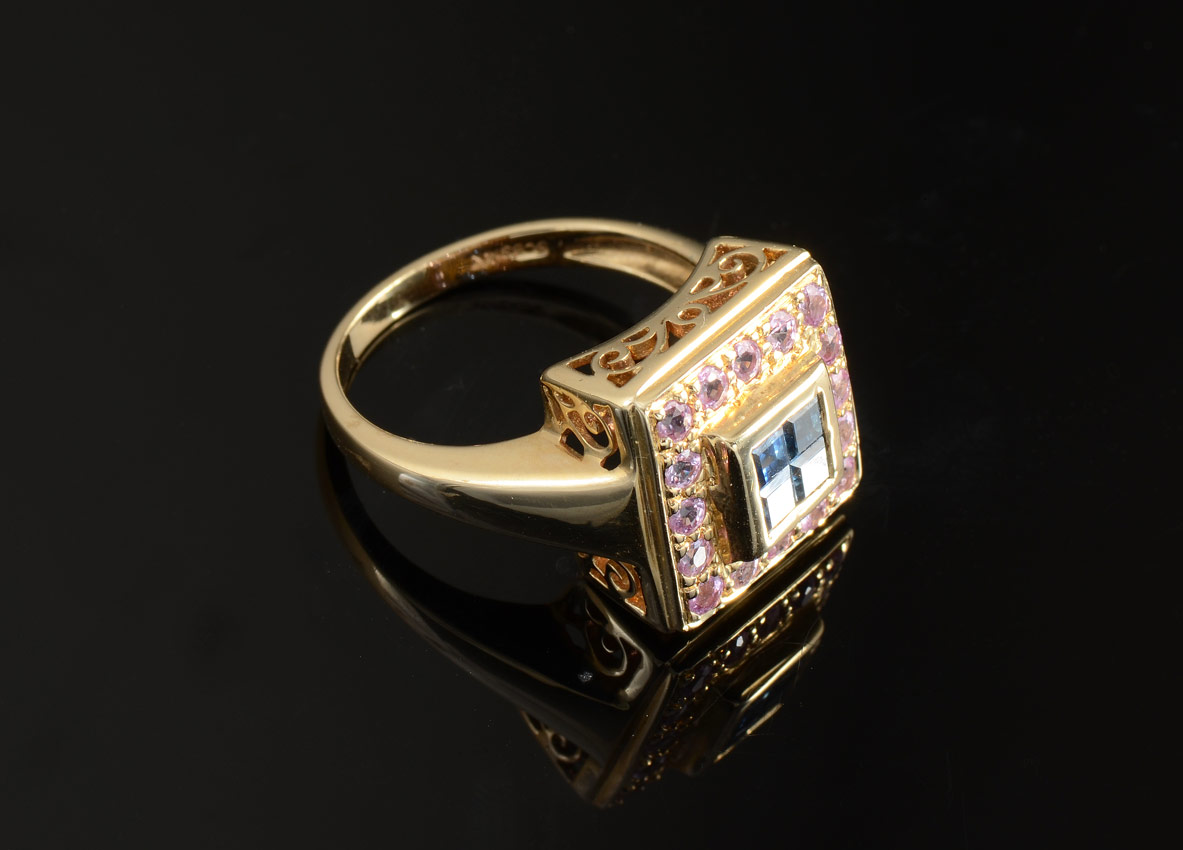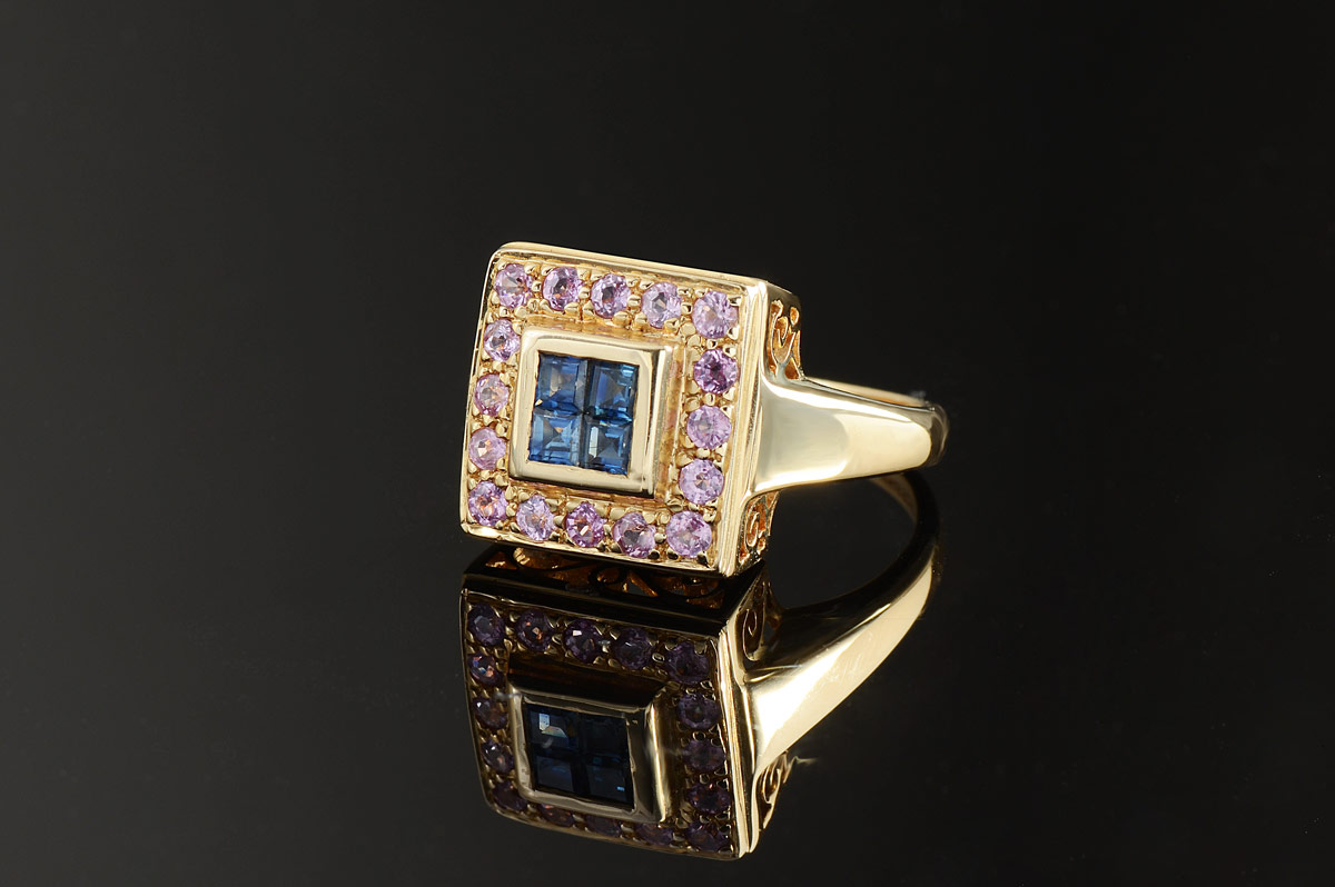 PINK AND BLUE SAPPHIRE RING: 14K yellow gold ring contains four square cut blue sapphire and 16 round faceted pink sapphires totaling approx. 1.00 Ct. The sapphires are prong and invisible set. Weight: 5.3 grams Size: 7