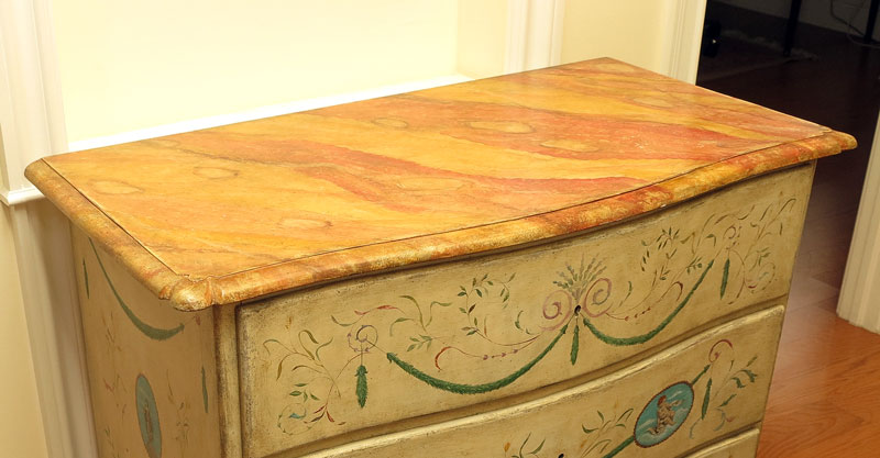 PAINT DECORATED FAUX FINISH 3 DRAWER CHEST: Serpentine front, paint decorated all over with swag and foliate motifs. Middle drawer with putti in medallions, neo-classical maidens on both sides. Shaped skirt. 35 1/2'' h. x 42 3/4'' l. x 22 1/2'' d.