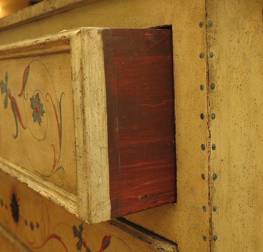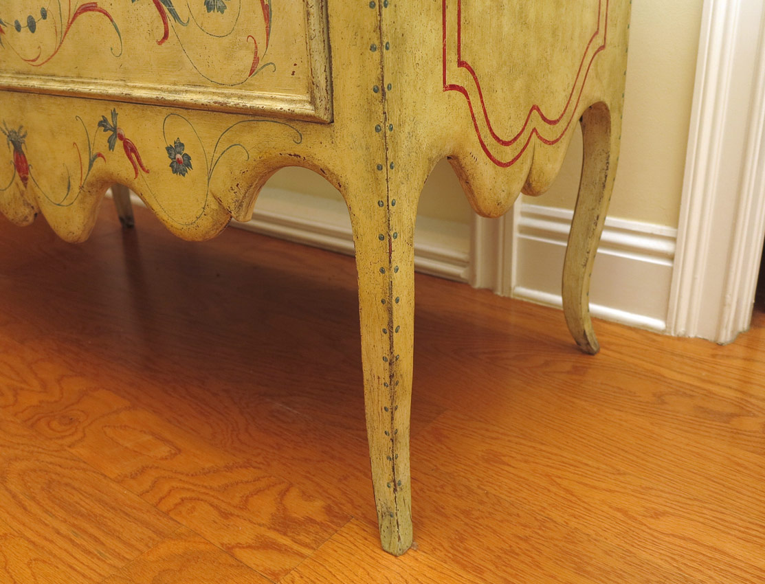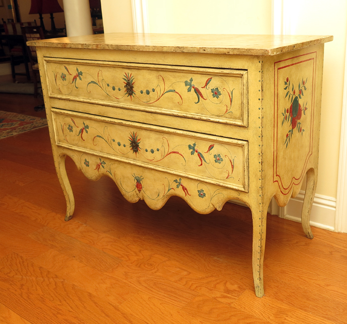 PAINT DECORATED FAUX FINISH 2 DRAWER CHEST: Paint decorated all over, front and sides with foliate scroll motifs. Shaped skirt and legs. 38 1/2'' h. x 52 3/4'' x 22 3/4''.