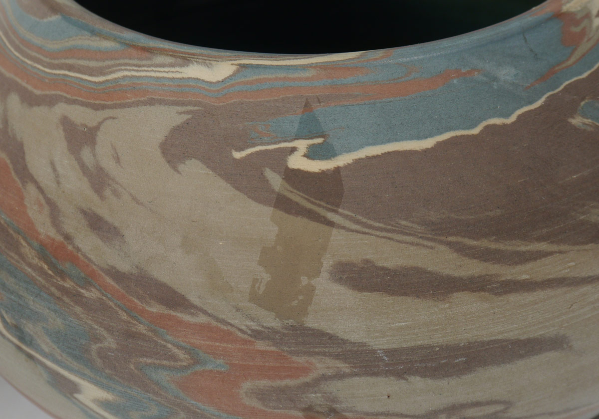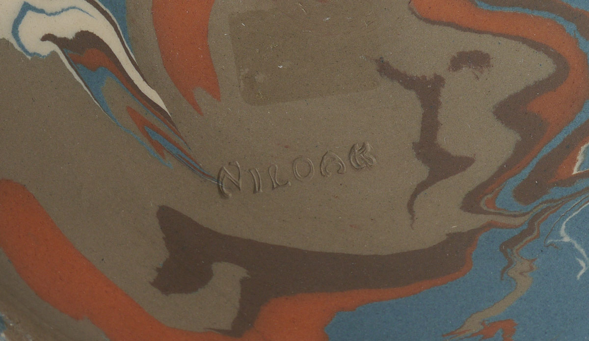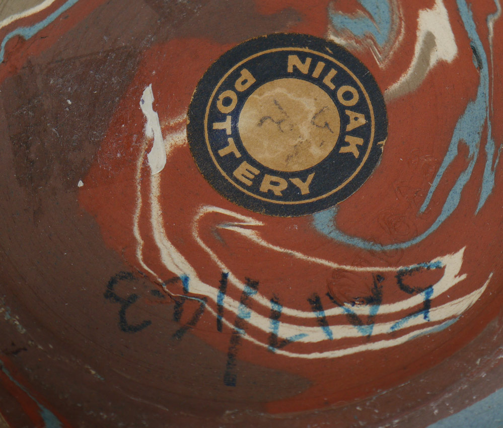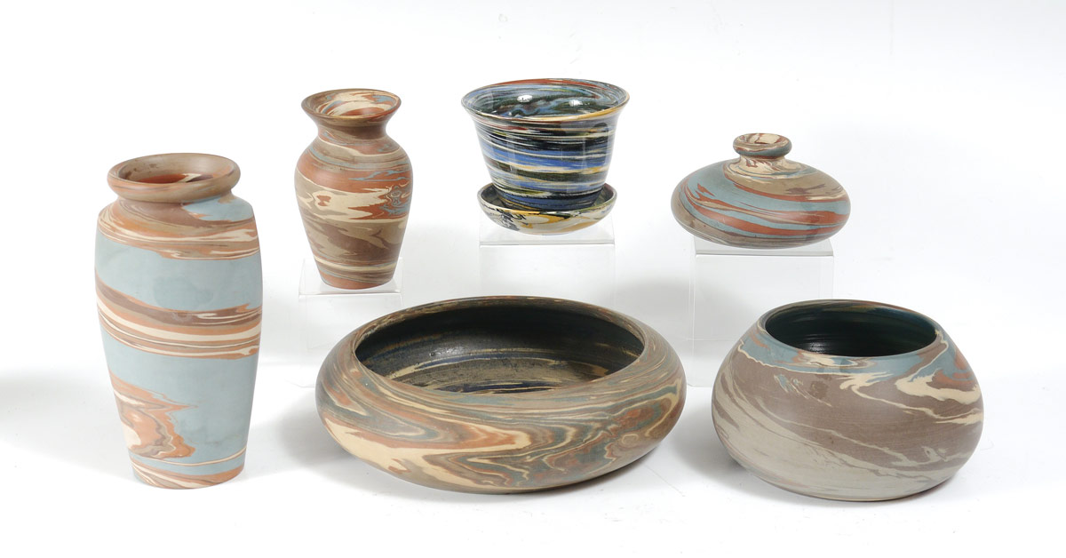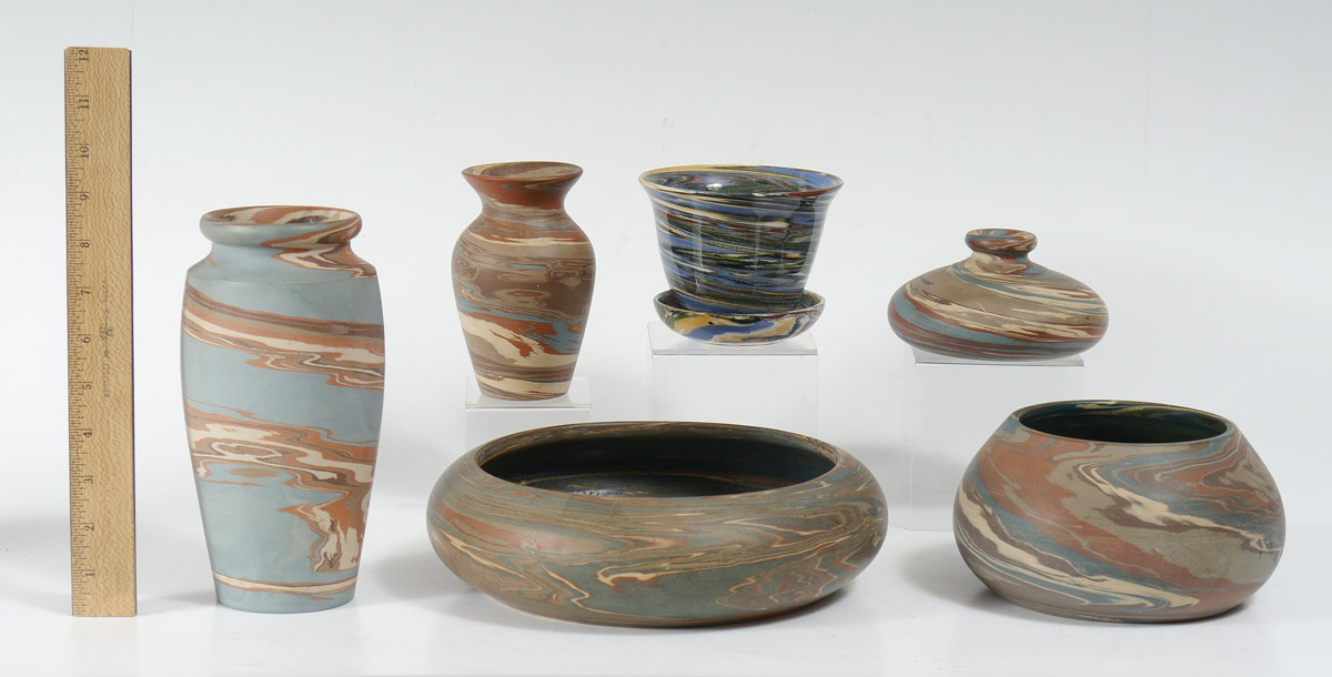 NILOAK MISSION WARE SWIRL POTTERY: 5 piece group of signed pottery, The tallest vase being 8 1/2'', the shortest 3'' x 10'' dia. Sold together with a high gloss Desert Sands flower pot, 4''.