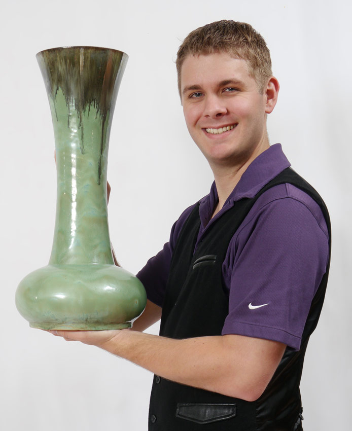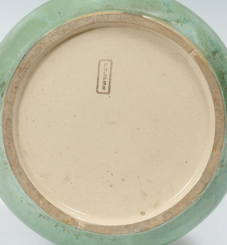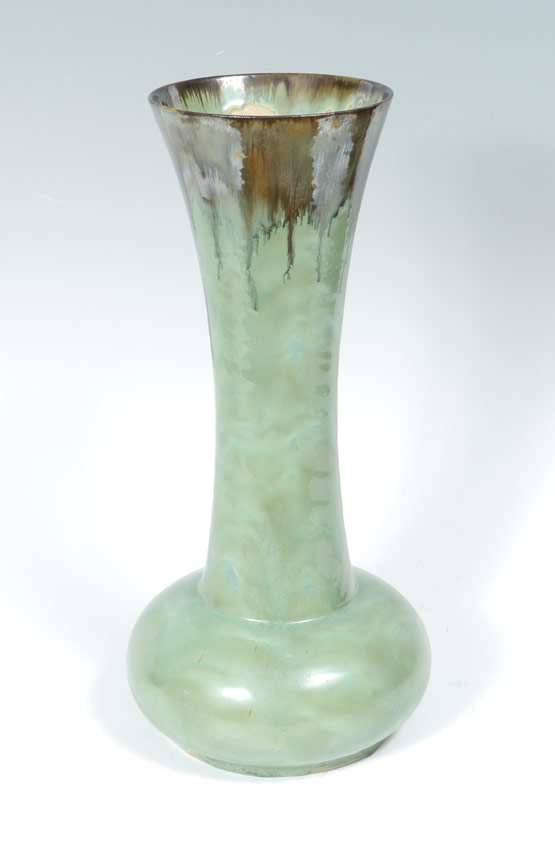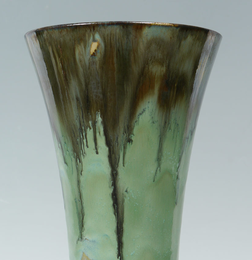 TALL SQUAT BASE FULPER POTTERY VASE: Stamp signature, green and grey drip glaze, 20 3/4'' h. x 10'' dia.