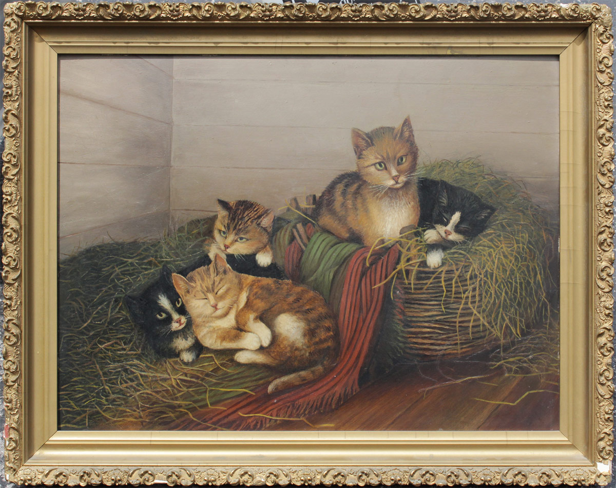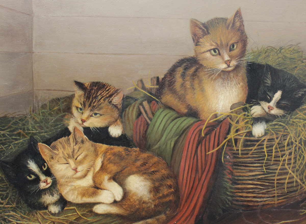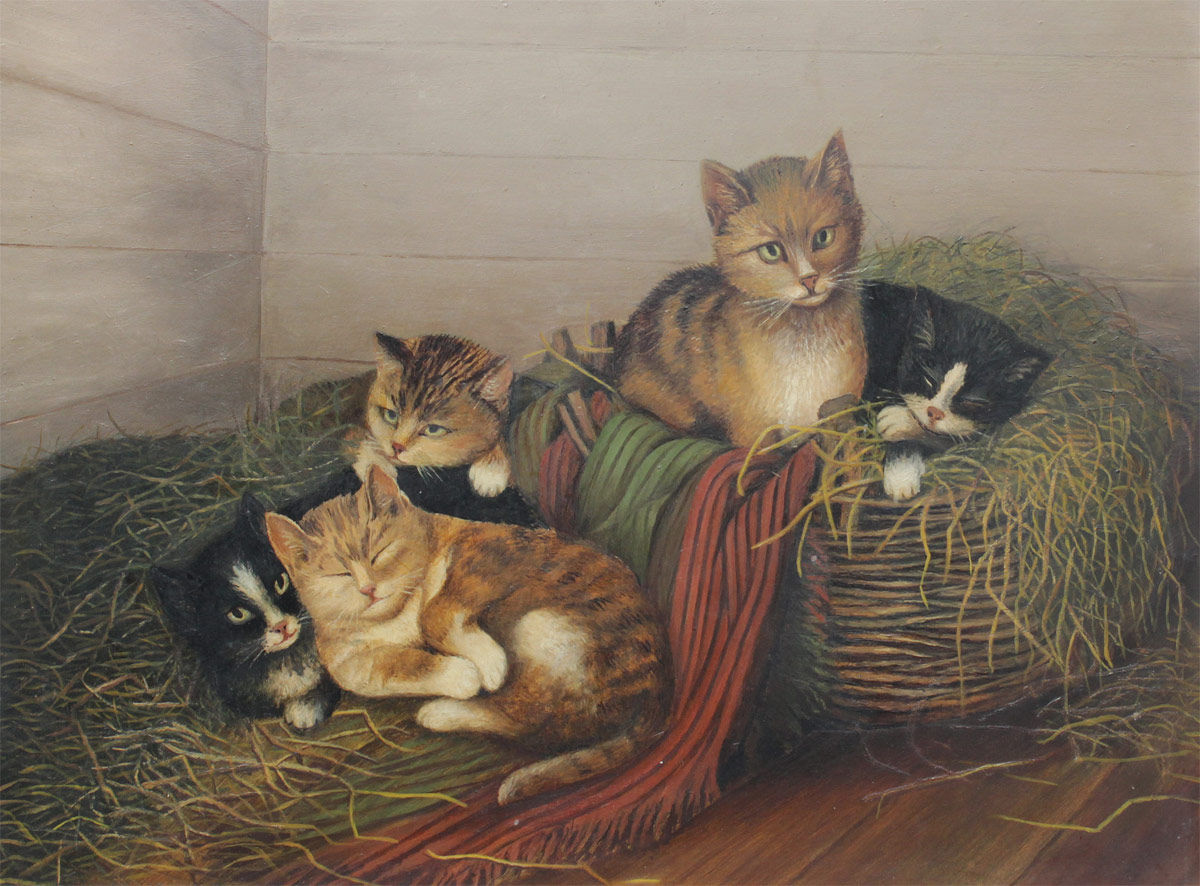NAIVE PAINTING OF KITTENS: 1st Quarter 20th Century, Oil/Board, unsigned, measures 18 1/2'' x 24 1/2'', painted and gilded frame with wear and missing gesso, 23'' x 29''.