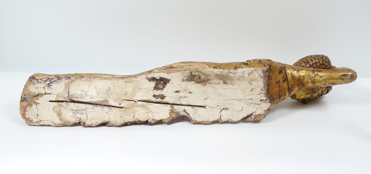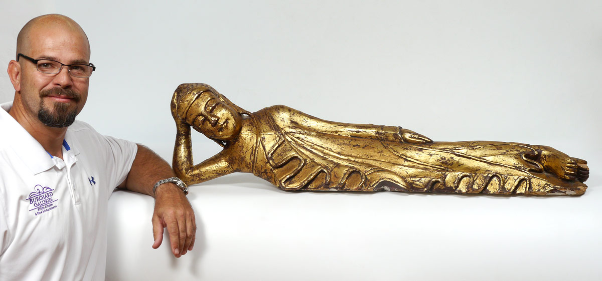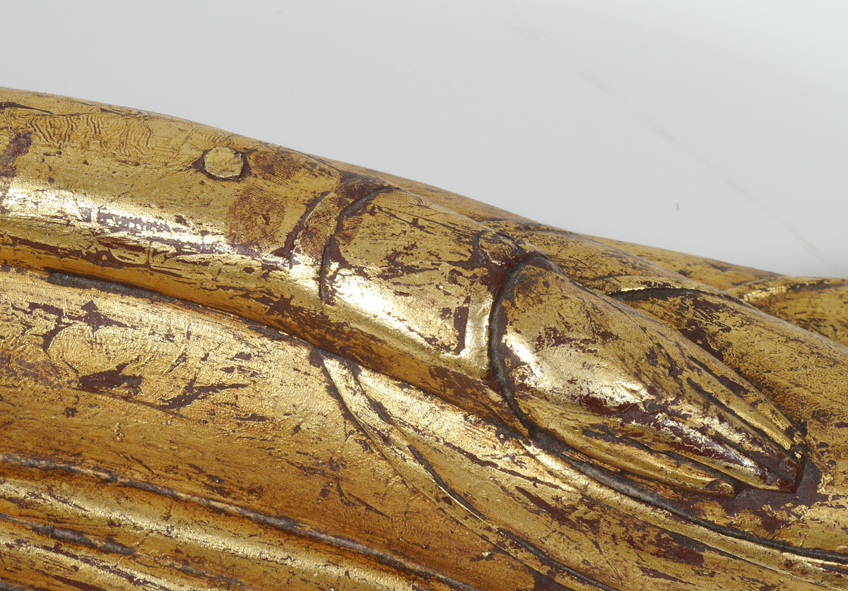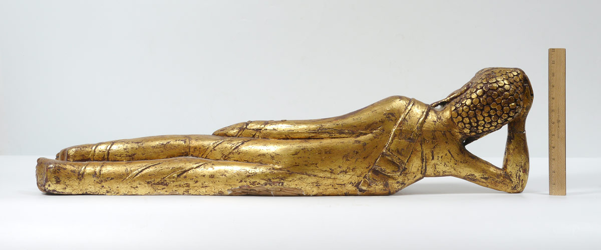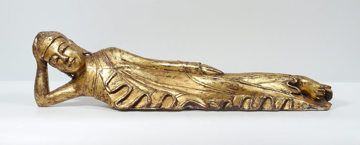 CARVED AND GILT DECORATED RECLINING BUDDHA: Figure of Buddha in repose, 10 3/4'' h. x 42 1/2'' x 8''.