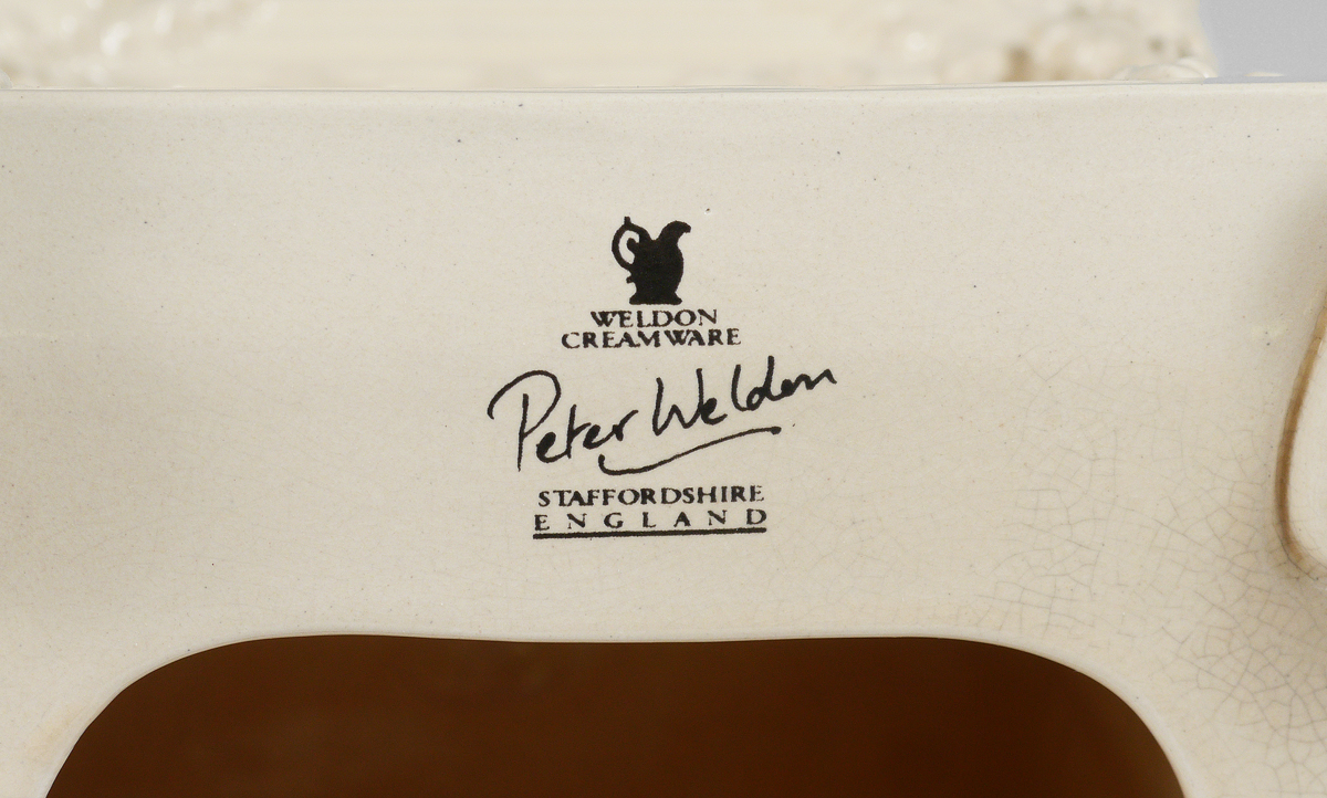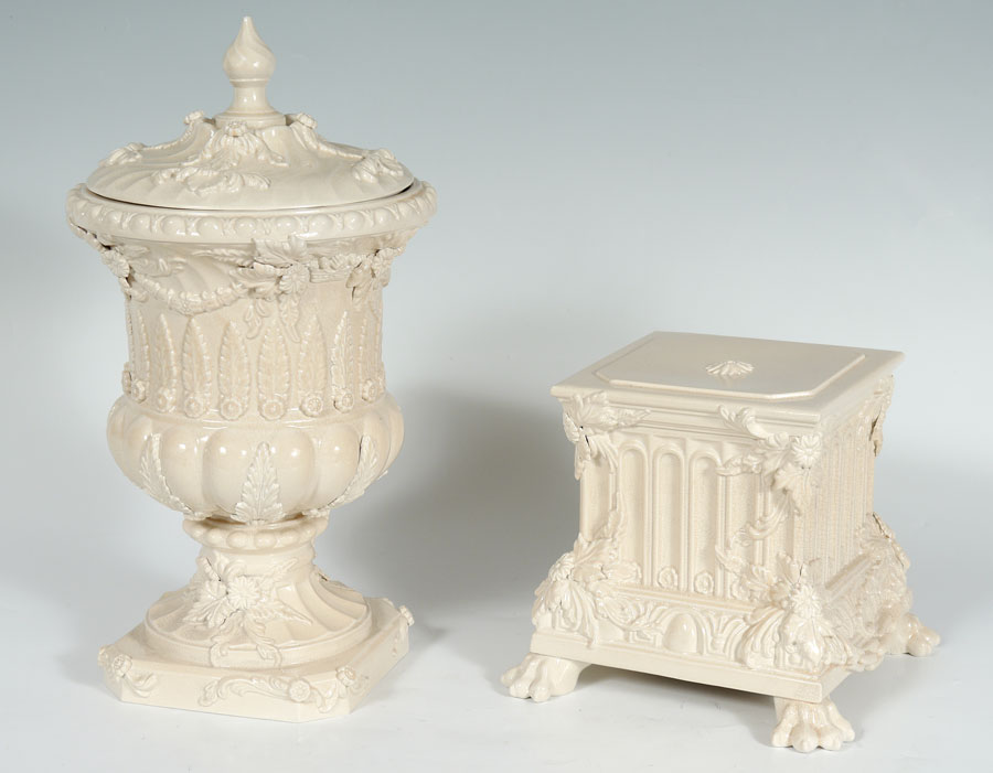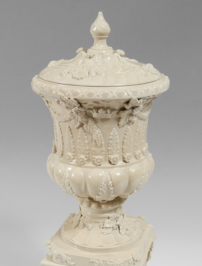 STAFFORDSHIRE PETER WELDON CREAMWARE URN ON STAND: Adamesque style covered urn and stand. Mark of Peter Weldon. Note: This piece is comprised of three pieces comprising two sections and a lid. Measures approx. 29'' tall, including stand x 8.5'' wide.