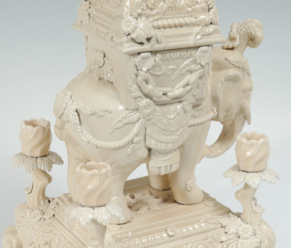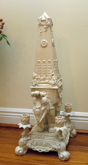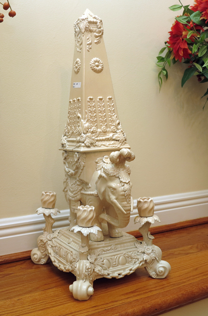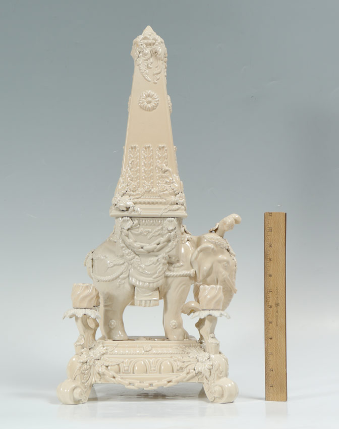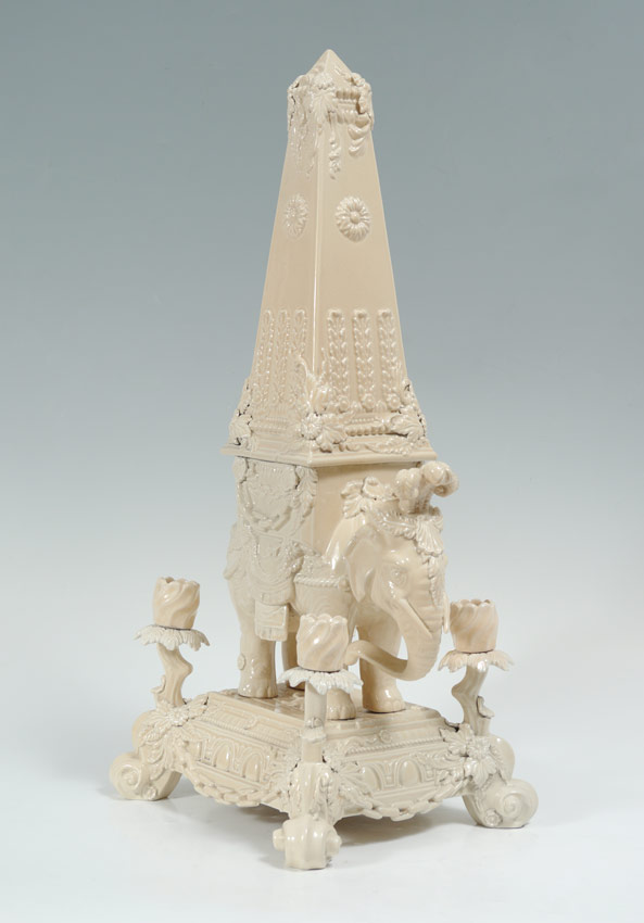 PETER WELDON CREAMWARE ELEPHANT OBELISK: Four light candle holder centering a dressed elephant under an obelisk. Unsigned. Measures 26''h. x 11'' x 10''.