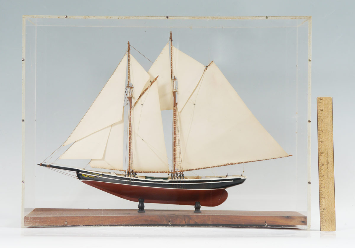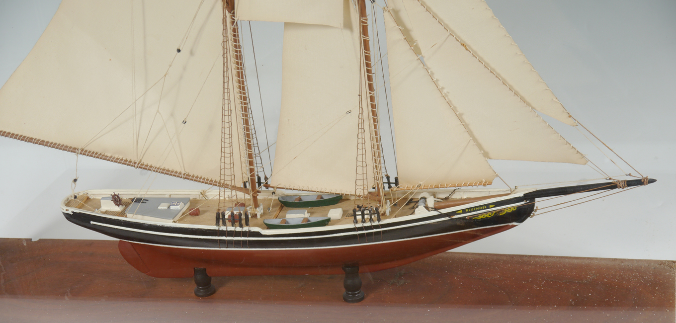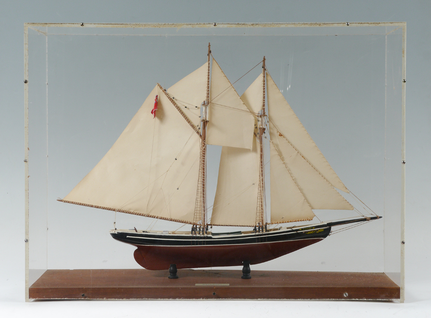 SHIPS MODEL OF THE RACING SCHOONER BLUENOSE IN CASE: Hand crafted ships model of the Canadian racing and fishing schooner ''Bluenose''. Model measures approx. 16'' h. x 23'' x 3 3/4'', case 19'' x 26'' x 7 1/2''.