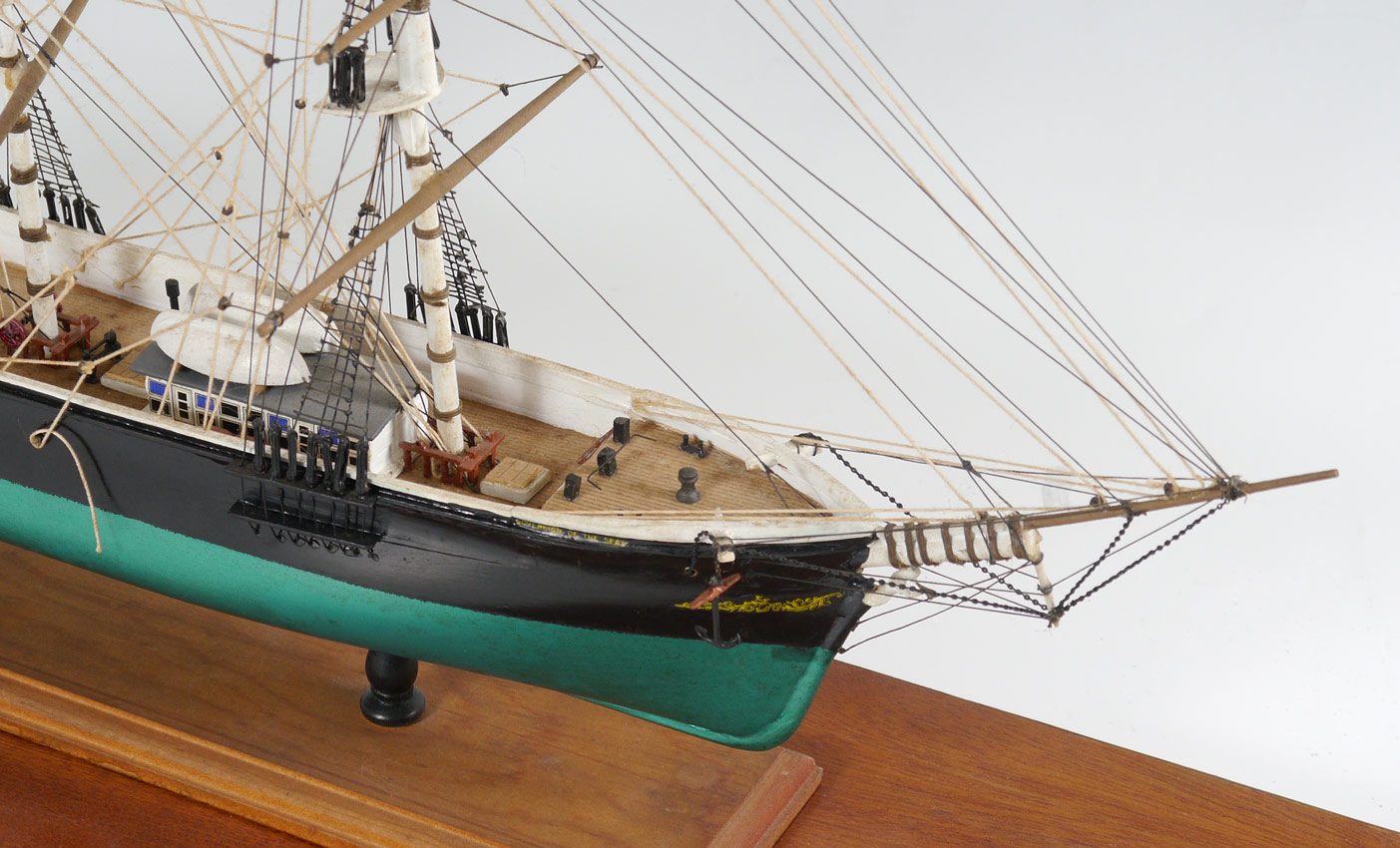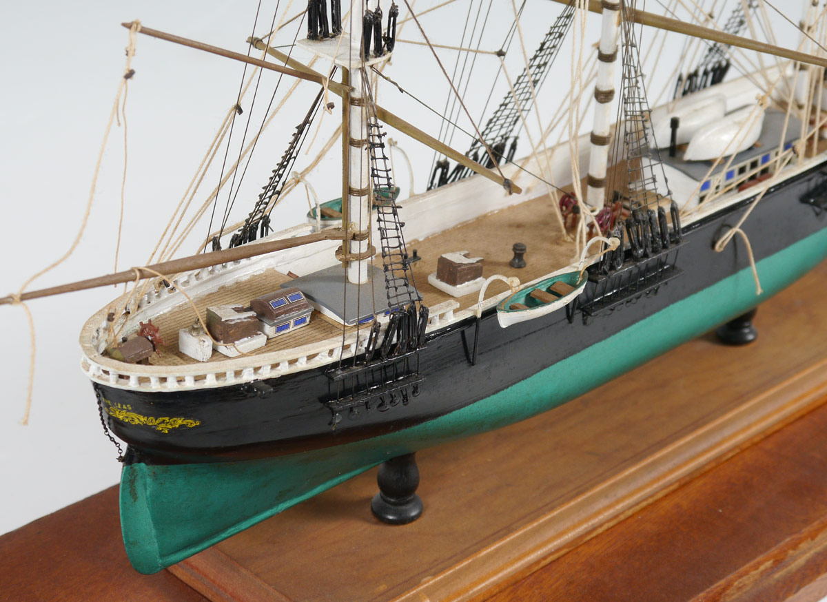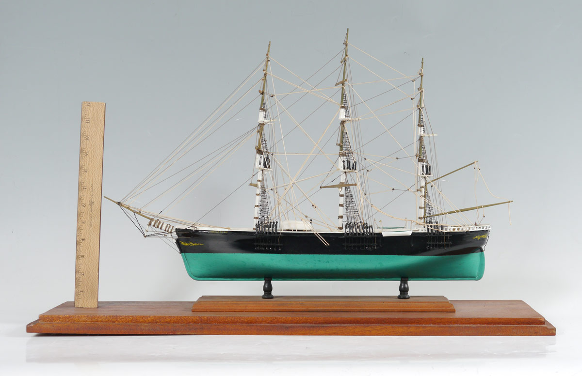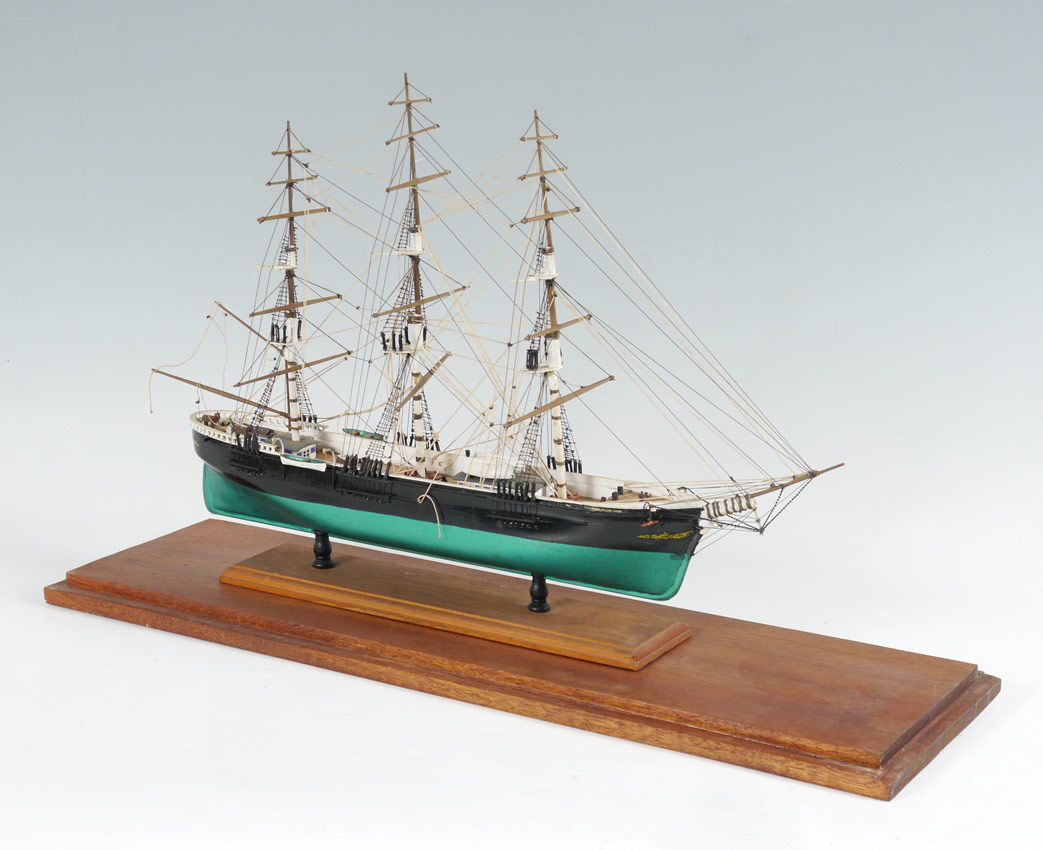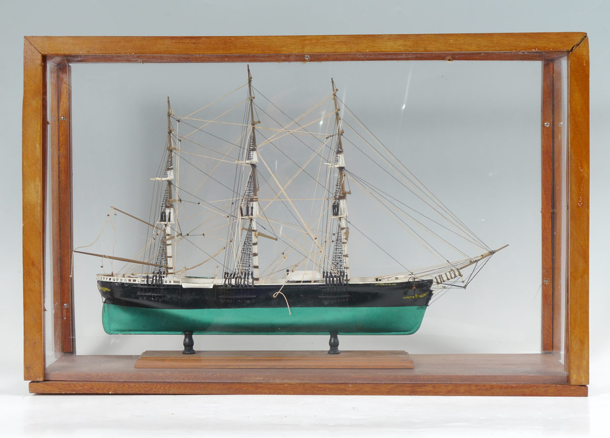 TRIPLE MAST SCHOONER SHIP'S MODEL IN CASE: Unidentified hand crafted triple mast schooner ships model. Ship measures 14 1/2'' h. x 23 1/2'' x 5'', case with Lexan 19'' h. x 29'' x 8 1/2''.